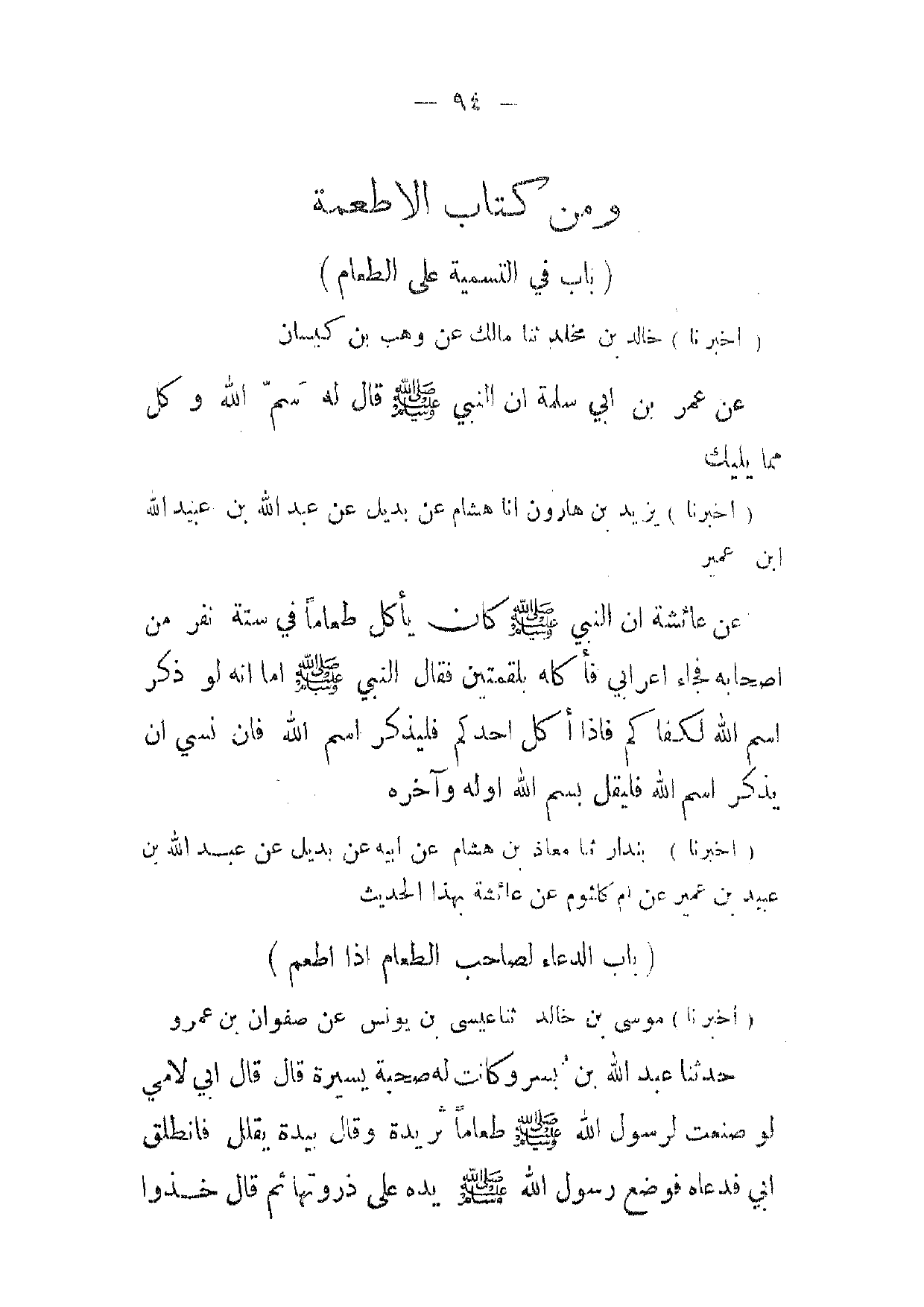 (أخبرنا) خالد بن مخلد ثنا مالك عن وهب بن كيسان عن عمر بن ابي سلمة ان النبي صلى الله عليه وسلم قال له سم الله وكل مما يليك