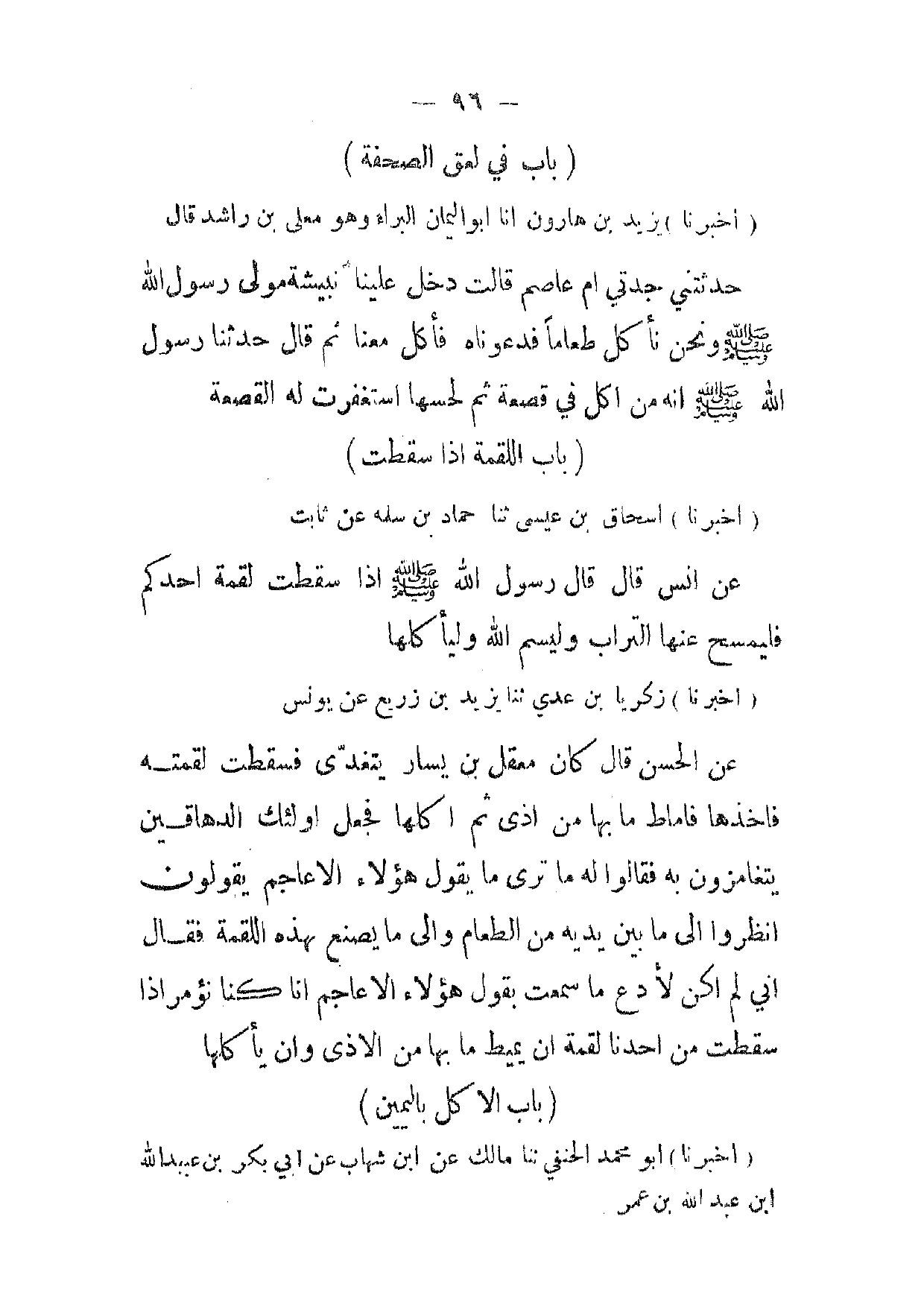 (أخبرنا) يزيد بن هارون انا أبو اليمان البراء وهو معلى بن راشد قال حدثتني جدتي ام عاصم قالت دخل علينا نبيشة مولى رسول الله صلى الله عليه وسلم ونحن نأكل طعاما فدعو ناه فأكل معنا ثم قال حدثنا رسول الله صلى الله عليه وسلم انه من اكل في قصعة ثم لحسها استغفرت له القصعة