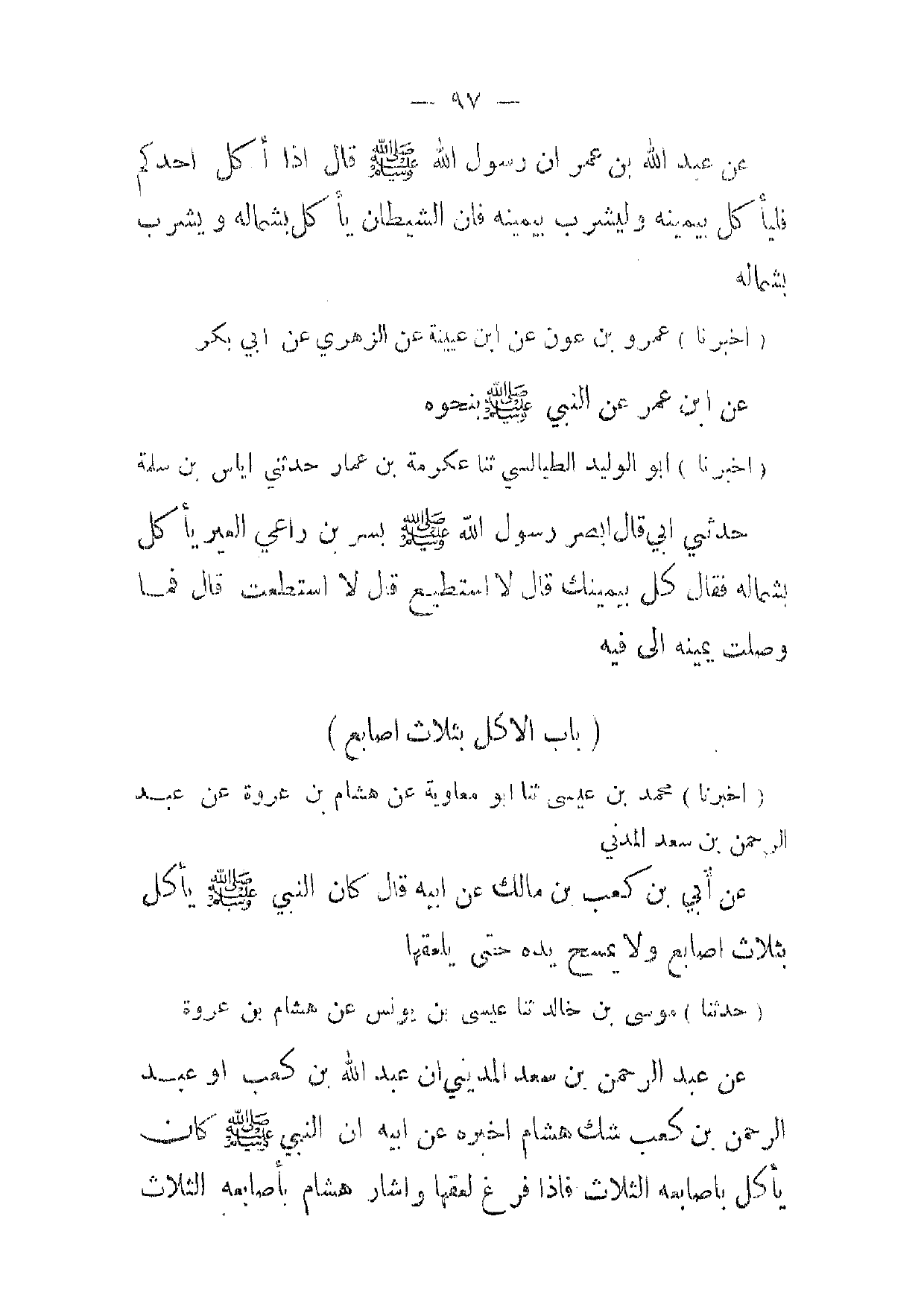 [ 97 ] عن عبد الله بن عمر ان رسول الله صلى الله عليه وسلم قال إذا أكل احدكم فليأ كل بيمينه وليشرب بيمينه فان الشيطان يأكل بشماله ويشرب بشماله