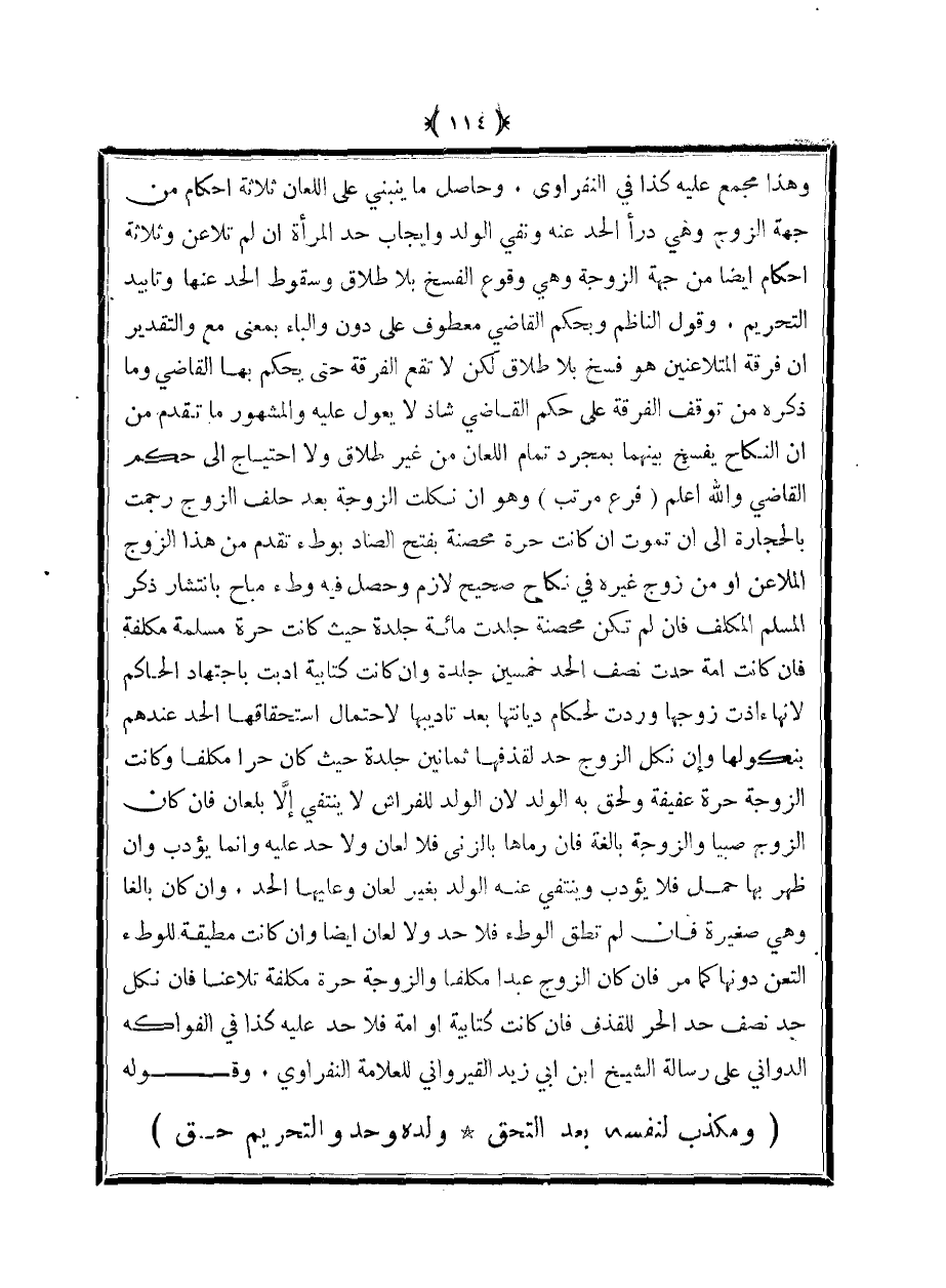 وهذا مجمع عليه كذا في النفراوي. وحاصل ما ينبني على اللعان ثلاثة أحكام من جهة الزوج وهي درأ الحد عنه ونفي الولد وإيجاب حد المرأة إن لم تلاعن وثلاثة أحكام أيضًا من جهة الزوجة وهي وقوع الفسخ بلا طلاق وسقوط الحد عنها وتأبيد التحريم. وقول الناظم وبحكم القاضي معطوف على دون والباء بمعنى مع والتقدير أن فرقة المتلاعنين هو فسخ بلا طلاق لكن لا تقع الفرقة حتى يحكم بها القاضي وما ذكره من توقف الفرقة على حكم القاضي شاذ لا يعول عليه والمشهور ما تقدم من أن النكاح يفسخ بينهما بمجرد تمام اللعان من غير طلاق ولا احتياج إلى حكم القاضي والله أعلم (فرع مرتب) وهو إن نكلت الزوجة بعد حلف الزوج رجمت بالحجارة إلى أن تموت إن كانت حرة محصنة بفتح الصاد بوطء تقدم من هذا الزوج الملاعن أو من زوج غيره في نكاح صحيح لازم وحصل فيه وطء مباح بانتشار ذكر المسلم المكلف فإن لم تكن محصنة جلدت مائة جلدة حيث كانت حرة مسلمة مكلفة فإن كانت أمة حدت نصف الحد خمسين جلدة وإن كانت كتابية أدبت باجتهاد الحاكم لأنها آذت زوجها وردت لحكام ديانتها بعد تأديبها لاحتمال استحقاقها الحد عندهم بنكولها وإن نكل الزوج حد لقذفها ثمانين جلدة حيث كان حرًا مكلفًا وكانت الزوجة حرة عفيفة ولحق به الولد لن الولد للفراش لا ينتفي إلا بلعان فإن كان الزوج صبيًا والزوجة بالغة فإن رماها بالزنى فلا لعان وعليها الحد. وإن كان بالغًا وهي صغيرة فإن لم تطق الوطء فلا حد ولا لعان أيضًا وإن كانت مطيقة للوطء التعن دونها كما مر فإن كان الزوج عبدًا مكلفًا والزوجة حرة مكلفة تلاعنا فإن نكل حد نصف حد الحر للقذف فإن كانت كتابية أو أمة فلا حد عليه كذا في الفواكه الدواني على رسالة الشيخ ابن أبي زيد القيرواني للعلامة النفراوي. وقوله
