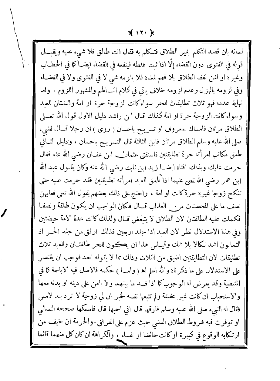 لسانه بان قصد التكلم بغير الطلاق فتكلم به فقال أنت طالق فلا شيء عليه ويقبل قوله في الفتوى دون القضاء إلا إذا ثبت غلطه فينفعه في القضاء أيضًا كما في الحطاب وغيره أو لقن لفظ الطلاق بلا فهم لمعناه فلا يلزمه شيء لا في الفتوى ولا في القضاء وفي لزومه بالهزل وعدم لزومه خلاف يأتي في كلام الناظم والمشهور اللزوم. وأما نهاية عدده فهو ثلاث تطليقات للحر سواء كانت الزوجة حرة أو أمة واثنتان للعبد وسواء كانت الزوجة حرة أو أمة كذلك قال ابن راشد دليل الأول قول الله تعالى: {الطلاق مرتان فإمساك بمعروف أو تسريح بإحسان} (روي) أن رجلًا قال للنبي صلى الله عليه وسلم الطلاق مرتان فأين الثالثة قال التسريح بإحسان. ودليل الثاني طلق مكاتب امرأة حرة تطليقتين فاستفتى عثمان ابن عفان رضي الله عنه فقال حرمت عليك وبذلك أفتاه أيضًا زيد بن ثابت رضي الله عنه وكان يقول عبد الله بن عمر رضي الله تعالى عنهما إذا طلق العبد امرأته تطليقتين فقد حرمت عليه حتى تنكح زوجًا غيره حرة كانت أو أمة. واحتج على ذلك بعضهم بقول الله تعالى: {فعليهن نصف ما على المحصنات من العذاب} قال فكان الواجب أن يكون طلقة ونصفًا فكملت عليه الطلقتان لأن الطلاق لا يتبعض قال ولذلك كانت عدة الأمة حيضتين وفي هذا الاستدلال نظر لأن العبد إذا جلد أربعين فذلك أرفق من جلد الحر إذ الثمانون أشد نكالًا بلا شك وقياس هذا أن يكون للحر طلقتان وللعبد ثلاث تطليقات لأن التطليقتين أضيق من الثلاث وذلك مما لا يقوله أحد فوجب أن يقتصر على الاستدلال على ما ذكرناه والله أعلم اهـ (وأما) حكمه فالأصل فيه الإباحة كما في المتيطية وقد يعرض له الوجوب كما إذا فسد ما بينهما ولا يأمن على دينه أو بدنه معها والاستحباب إن كانت غير عفيفة ولم تتبعها نفسه لخبر إن لي زوجة لا ترد يد لامس فقال له النبي صلى الله عليه وسلم فارقها قال إني أحبها قال فأمسكها صححه النسائي أو توفرت فيه شروط الطلاق السني حيث عزم على الفراق. والحرمة وإن خيف من ارتكابه الوقوع في كبيرة أو كانت حائضًا أو نفساء. والكراهة إن كان كل منهما قائمًا