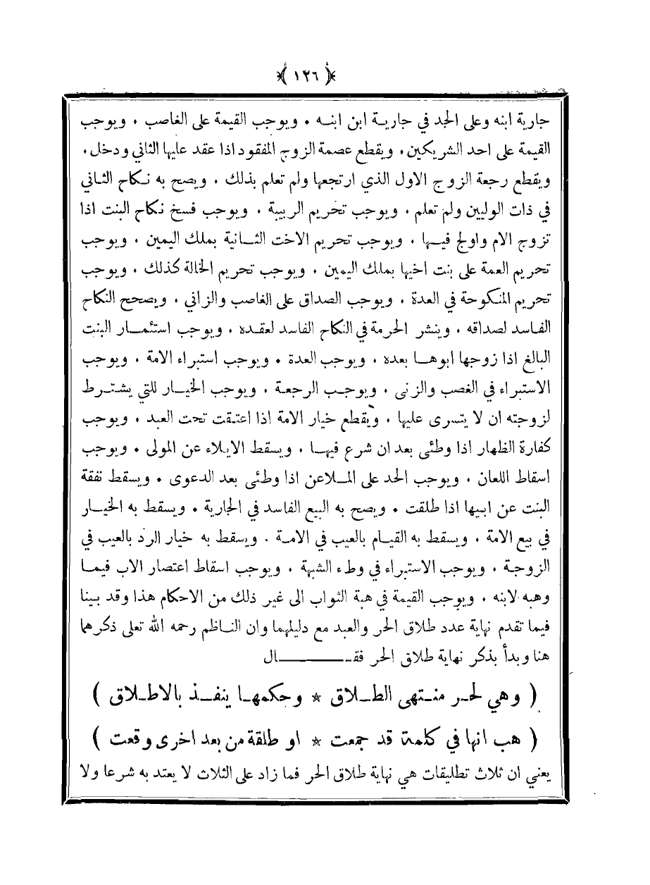 جارية ابنه وعلى الجد في جارية ابن ابنه. ويوجب القيمة على الغاصب. ويوجب القيمة على أحد الشريكين. ويقطع عصمة الزوج المفقود إذا عقد عليها الثاني ودخل، ويقطع رجعة الزوج الأول الذي ارتجعها ولم تعلم بذلك. ويصح به نكاح الثاني في ذات الوليين ولم تعلم. ويوجب تحريم الربيبة. ويوجب فسخ نكاح البنت إذا تزوج الأم وأولج فيها. ويوجب تحريم الأخت الثانية بملك اليمين. ويوجب تحريم العمة على بنت أخيها بملك اليمين. ويوجب تحريم الخالة كذلك. ويوجب تحريم المنكوحة في العدة. ويوجب الصداق على الغاصب والزاني. ويصحح النكاح الفاسد لصداقه. وينشر الحرمة في النكاح الفاسد لعقده. ويوجب استئمار البنت البالغ إذا زوجها أبوها بعده. ويوجب العدة. ويوجب استبراء الأمة. ويوجب الاستبراء في الغصب والزنى. ويوجب الرجعة. ويوجب الخيار للتي يشترط لزوجته أن لا يتسرى عليها. ويقطع خيار الأمة إذا أعتقت تحت العبد. ويوجب كفارة الظهار إذا وطئ بعد أن شرع فيها. ويسقط الإيلاء عن المولي. ويوجب إسقاط اللعان. ويوجب الحد على الملاعن إذا وطئ بعد الدعوى. ويسقط نفقة البنت عن أبيها إذا طلقت. ويصح به البيع الفاسد في الجارية. ويسقط به الخيار في بيع الأمة. ويسقط به القيام بالعيب في الأمة. ويسقط به خيار الرد بالعيب في الزوجة. ويوجب الاستبراء في وطء الشبهة. ويوجب إسقاط اعتصار الأب فيما وهبه لابنه. ويوجب القيمة في هبة الثواب إلى غير ذلك من الأحكام هذا وقد بينا فيما تقدم نهاية عدد طلاق الحر والعبد مع دليلهما وأن الناظم رحمه الله تعالى ذكرهما هنا وبدأ بذكر نهاية طلاق الحر فقال