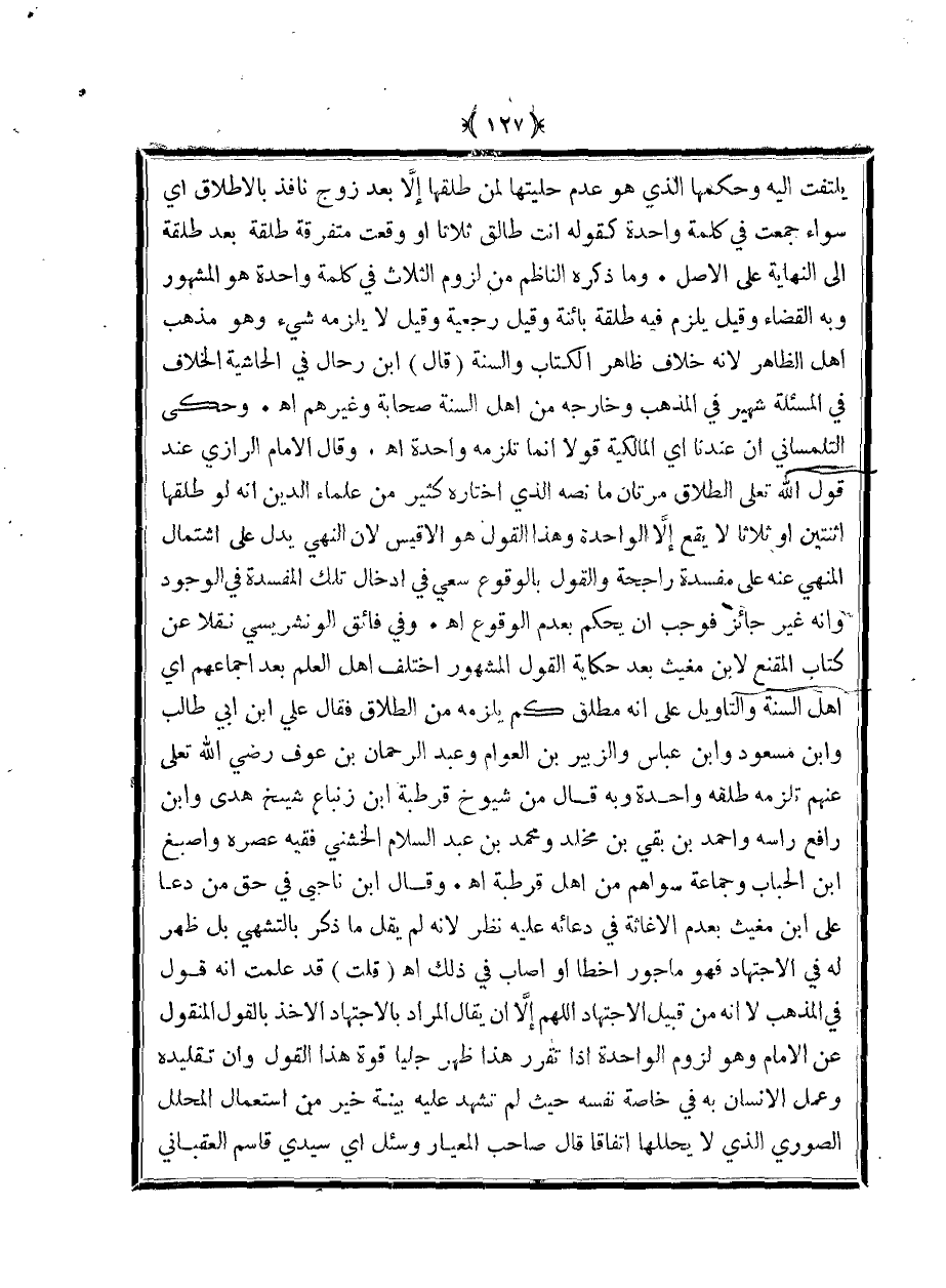 يلتفت إليه وحكمها الذي هو عدم حليتها لمن طلقها إلا بعد زوج نافذ بالإطلاق أي سواء جمعت في كلمة واحدة كقوله أنت طالق ثلاثًا أو وقعت متفرقة طلقة بعد طلقة إلى النهاية على الأصل. وما ذكره الناظم من لزوم الثلاث في كلمة واحدة هو المشهور وبه القضاء وقيل يلزم فيه طلقة بائنة وقيل رجعية وقيل لا يلزمه شيء وهو مذهب أهل الظاهر لأنه خلاف ظاهر الكتاب والسنة (قال) ابن رحال في الحاشية الخلاف في المسألة شهير في المذهب وخارجه من أهل السنة صحابة وغيرهم اهـ. وحكى التلمساني أن عندنا أي المالكية قولًا إنما تلزمه واحدة اهـ. وقال الإمام الرازي عند قول الله تعالى: {الطلاق مرتان} ما نصه الذي اختاره كثير من علماء الدين أنه لو طلقها اثنتين أو ثلاثًا لا يقع إلا الواحدة وهذا القول الأقيس لأن النهي يدل على اشتمال المنهي عنه على مفسدة راجحة والقول بالوقوع سعي في إدخال تلك المفسدة في الوجود وأنه غير جائز فوجب أن يحكم بعدم الوقوع اهـ. وفي فائق الونشريسي نقلًا عن كتاب المقنع لابن مغيث بعد حكاية القول المشهور اختلف أهل العلم بعد إجماعهم أي أهل السنة والتأويل على أنه مطلق كم يلزمه من الطلاق فقال علي بن أبي طالب وابن مسعود وابن عباس والزبير بن العوام وعبد الرحمن بن عوف رضي الله تعالى عنهم تلزمه طلقة واحدة وبه قال من شيوخ قرطبة ابن زنباع شيخ هدى وابن رافع رأسه وأحمد بن بقي بن مخلد ومحمد بن عبد السلام الخشني فقيه عصره وأصبغ بن الحباب وجماعة سواهم من أهل قرطبة اهـ. وقال ابن ناجي في حق من دعا على ابن مغيث بعدم الإغاثة في دعائه عليه نظر لأنه لم يقل ما ذكر بالتشهي بل ظهر له في الاجتهاد فهو مأجور أخطأ أو أصاب في ذلك اهـ (قلت) قد علمت أنه قول في المذهب لا أنه من قبيل الاجتهاد اللهم إلا أن يقال المراد بالاجتهاد الأخذ بالقول المنقول عن الإمام وهو لزوم الواحدة إذا تقرر هذا ظهر جليًا قوة هذا القول وان تقليده وعمل الإنسان به في خاصة نفسه حيث لم تشهد عليه بينة خير من استعمال المحلل الصوري الذي لا يحللها اتفاقًا قال صاحب المعيار وسئل أي سيدي قاسم العقباني