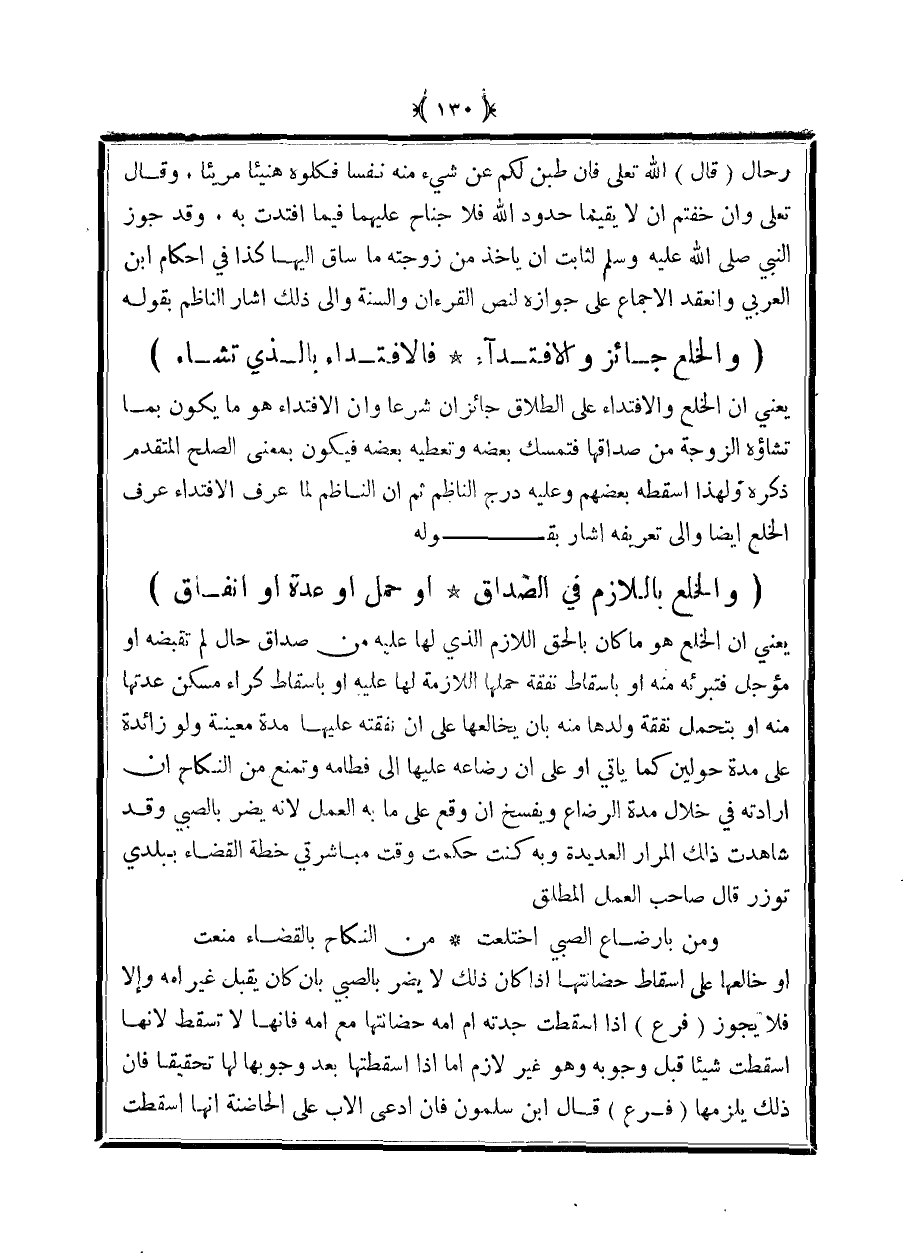 رحال (قال) الله تعالى: {فإن طبن لكم عن شيء منه نفسًا فكلوه هنيئًا مريئًا}. وقال تعالى: {وإن خفتم ألا يقيما حدود الله فلا جناح عليهما فيما افتدت به}. وقد جوز النبي صلى الله عليه وسلم لثابت أن يأخذ من زوجته ما ساق إليها كذا في أحكام ابن العربي وانعقد الإجماع على جوازه لنص القرآن والسنة وإلى ذلك أشار الناظم بقوله