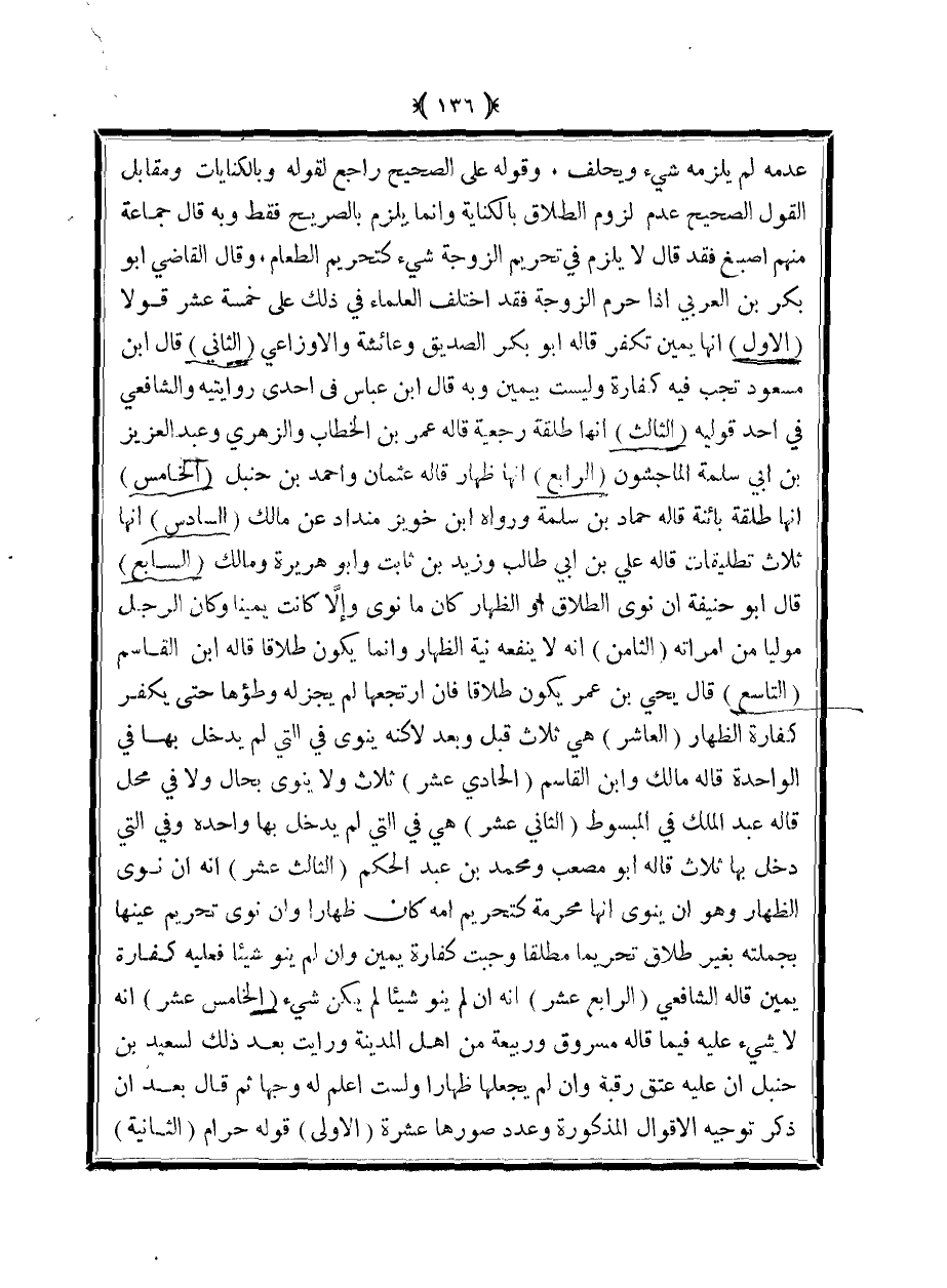 عدمه لم يلزمه شيء ويحلف. وقوله على الصحيح راجع لقوله وبالكنايات ومقابل القول الصحيح عدم لزوم الطلاق بالكناية وإنما يلزم بالصريح فقط وبه قال جماعة منهم أصبغ فقد قال لا يلزم في تحريم الزوجة شيء كتحريم الطعام. وقال القاضي أبو بكر بن العربي إذا حرم الزوجة فقد اختلف العلماء في ذلك على خمسة عشر قولًا (الأول) أنها يمين تكفر قاله أبو بكر الصديق وعائشة والأوزاعي (الثاني) قال ابن مسعود تجب فيه كفارة وليست بيمين وبه قال ابن عباس في إحدى روايتيه والشافعي في أحد قوليه (الثالث) أنها طلقة رجعية قاله عمر بن الخطاب والزهري وعبد العزيز بن أبي سلمة الماجشون (الرابع) أنها ظهار قاله عثمان وأحمد بن حنبل (الخامس) أنها طلقة بائنة قاله حماد بن سلمة ورواه ابن خويز منداد عن مالك (السادس) أنها ثلاث تطليقات قاله علي بن أبي طالب وزيد بن ثابت وأبو هريرة ومالك (السابع) قال أبو حنيفة إن نوى الطلاق أو الظهار كان ما نوى وإلا كانت يمينًا وكان الرجل موليًا من امرأته (الثامن) أنه لا ينفعه نية الظهار وإنما يكون طلاقًا قاله ابن القاسم (التاسع) قال يحيى بن عمر يكون طلاقًا فإن ارتجعها لم يجز له وطؤها حتى يكفر كفارة الظهار (العاشر) هي ثلاث قبل وبعد لكنه ينوي في التي لم يدخل بها في الواحدة قاله مالك وابن القاسم (الحادي عشر) ثلاث ولا ينوي بحال ولا في محا قاله عبد الملك في المبسوط (الثاني عشر) هي في التي لم يدخل بها واحدة وفي التي دخل بها ثلاث قاله أبو مصعب ومحمد بن عبد الحكم (الثالث عشر) أنه إن نوى الظهار وهو أن ينوي أنها محرمة كتحريم أمه كان ظهارًا وإن نوى تحريم عينها بجملته بغير طلاق تحريمًا مطلقًا وجبت كفارة يمين وإن لم ينو شيئًا فعليه كفارة يمين قاله الشافعي (الرابع عشر) أنه إن لم ينو شيئًا لم يكن شيء (الخامس عشر) أنه لا شيء عليه فيما قاله مسروق وربيعة من أهل المدينة ورأيت بعد ذلك لسعيد بن حنبل أن عليه عتق رقبة وإن لم يجعلها ظهارًا ولست أعلم له وجهًا ثم قال بعد أن ذكر توجيه الأقوال المذكورة وعدد صورها عشرة (الأولى) قوله حرام (الثانية)