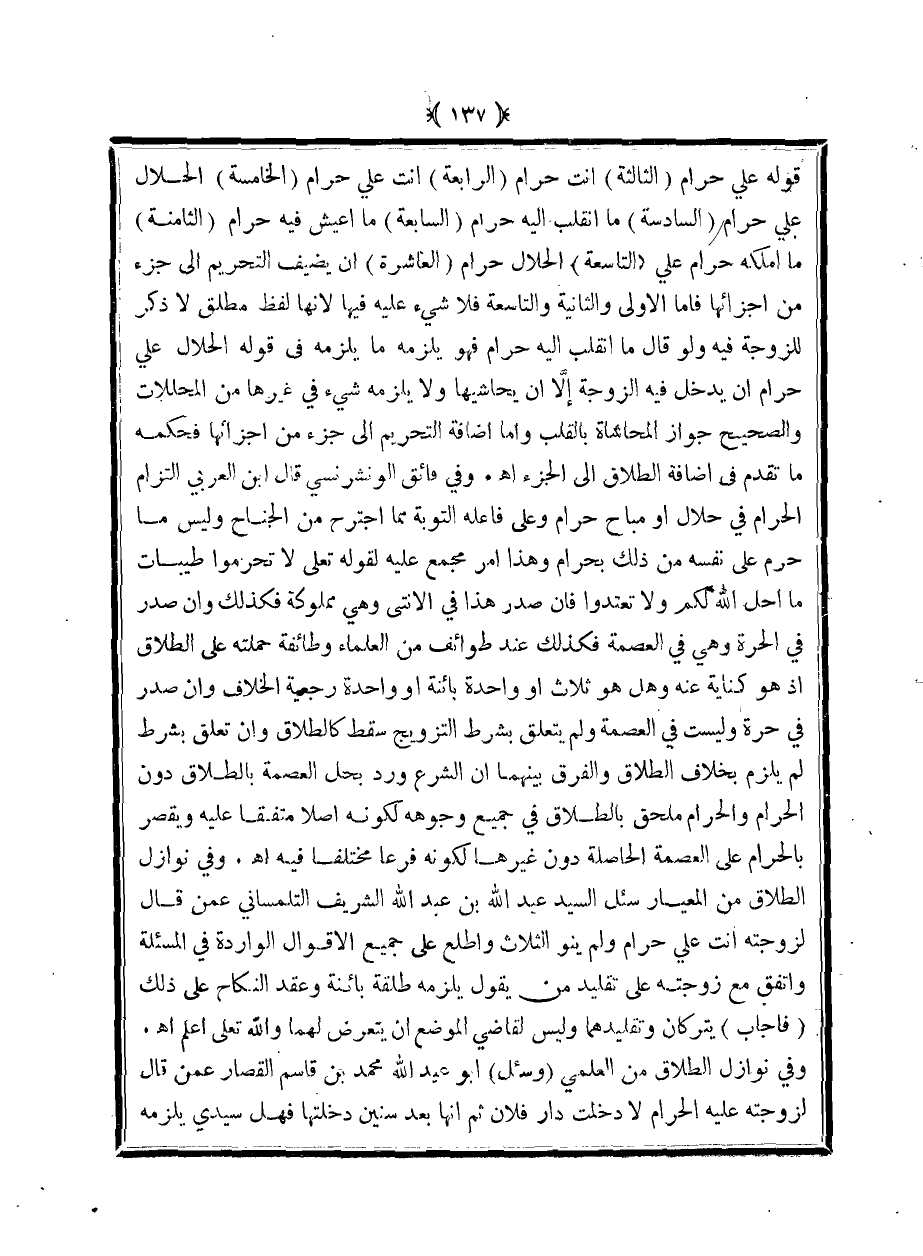 قوله علي حرام (الثالثة) أنت حرام (الرابعة) أنت علي حرام (الخامسة) الحلال علي حرام (السادسة) ما أنقلب إليه حرام (السابعة) ما أعيس فيه حرام (الثامنة) ما أملكه حرام علي (التاسعة) الحلال حرام (العاشرة) أن يضيف التحريم إلى جزء من أجزائها فأما الأولى والثانية والتاسعة فلا شيء عليه فيها لأنها لفظ مطلق لا ذكر للزوجة فيه ولو قال ما أنقلب إليه حرام فهو يلزمه ما يلزمه في قوله الحلال علي حرام أن يدخل فيه الزوجة إلا أن يحاشيها ولا يلزمه شيء في غيرها من المحللات والصحيح جواز المحاشاة بالقلب وأما إضافة التحريم إلى جزء من أجزائها فحكمه ما تقدم في إضافة الطلاق إلى الجزء اهـ. وفي فائق الونشريسي قال ابن العربي التزام الحرام في حلال أو مباح حرام وعلى فاعله التوبة مما اجترح من الجناح وليس ما حرم على نفسه من ذلك بحرام وهذا أمر مجمع عليه لقوله تعالى: {لا تحرموا طيبات ما أحل الله لكم ولا تعتدوا} فإن صدر هذا في الأنثى وهي مملوكة فكذلك وإن صدر في الحرة وهي في العصمة فكذلك عند طوائف من العلماء وطائفة حملته على الطلاق إذ هو كناية عنه وهل هو ثلاث أو واحدة بائنة أو واحدة رجعية الخلاف وإن صدر في حرة وليست في العصمة ولم يتعلق بشرط التزويج سقط كالطلاق وإن تعلق بشرط لم يلزم بخلاف الطلاق والفرق بينهما أن الشرع ورد بحل العصمة بالطلاق دون الحرام والحرام ملحق بالطلاق في جميع وجوهه لكونه أصلًا متفقًا عليه ويقصر بالحرام على العصمة الحاصلة دون غيرها لكونه فرعًا مختلفًا فيه اهـ. وفي نوازل الطلاق من المعيار سئل السيد عبد الله بن عبد الله الشريف التلمساني عمن قال لزوجته أنت علي حرام ولم ينو الثلاث واطلع على جميع الأقوال الواردة في المسألة واتفق مع زوجته على تقليد من يقول يلزمه طلقة بائنة وعقد النكاح على ذلك (فأجاب) يتركان وتقليدهما وليس لقاضي الموضع أن يتعرض لهما والله تعالى أعلم اهـ. وفي نوازل الطلاق من العلمي (وسئل) أبو عبد الله محمد بن القاسم القصار عمن قال لزوجته عليه الحرام لو دخلت دار فلان ثم إنها بعد سنين دخلتها فهل سيدي يلزمه