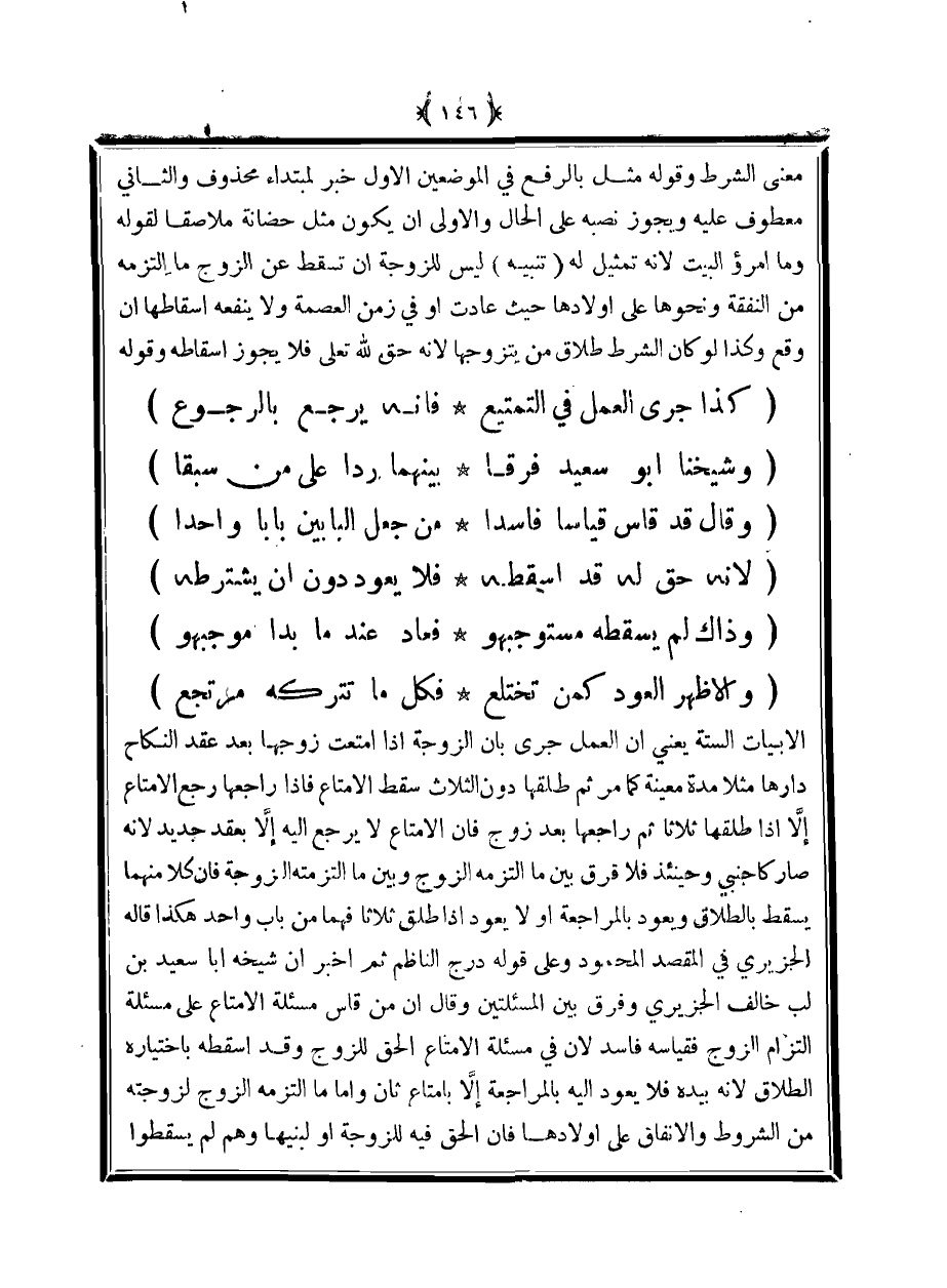 الأبيات الستة يعني أن العمل جرى بأن الزوجة إذا أمتعت زوجها بعد عقد النكاح دارها مثلًا مدة معينة كما مر ثم طلقها دون الثلاث سقط الإمتاع فإذا راجعها رجع الإمتاع إلا إذا طلقها ثلاثًا ثم راجعها بعد زوج فإن الإمتاع لا يرجع إليه إلا بعقد جديد لأنه صار كأجنبي وحينئذ فلا فرق بين ما التزمه الزوج وبين ما التزمته الزوجة فإن كلًا منهما يسقط بالطلاق ويعود بالمراجعة أو لا يعود إذا طلق ثلاثًا فهما من باب واحد هكذا قاله الجزيري في المقصد المحمود وعلى قوله درج الناظم ثم أخبر أن شيخه أبا سعيد بن لب خالف الجزيري وفرق بين المسألتين وقال أن من قاس مسألة الإمتاع على مسألة التزام الزوج فقياسه فاسد لأن في مسألة الإمتاع الحق للزوج وقد أسقطه باختياره الطلاق لأنه بيده فلا يعود إليه بالمراجعة إلا بإمتاع ثان وأما ما التزمه الزوج لزوجته من الشروط والإنفاق على أولادها فإن الحق فيه للزوجة أو لبنيها وهم لم يسقطوا
