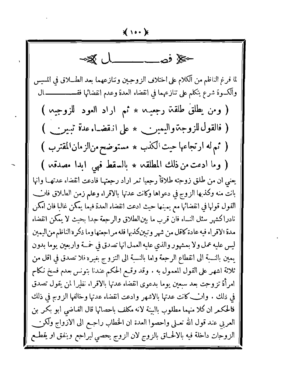 لما فرغ الناظم من الكلام على اختلاف الزوجين وتنازعهما بعد الطلاق في المسيس والكسوة شرع يتكلم على تنازعهما في انقضاء العدة وعدم انقضائها فقال