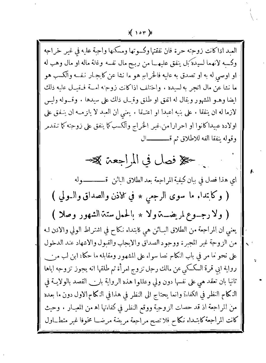 يعني أن المراجعة من الطلاق البائن هي كابتداء نكاح في اشتراط الولي والإذن له من الزوجة غير المجبرة ووجود الصداق والإيجاب والقبول والإشهاد عند الدخول على نحو ما مر في باب النكاح نصًا سواء على المشهور ومقابله ما حكاه ابن لب من رواية أبي قرة السكسكي عن مالك رجل تزوج امرأة ثم طلقها أنه يجوز تزوجه إياها ثانيًا بأن تعقد هي على نفسها دون ولي وعللوا هذه الرواية بأن القصد بالولاية في النكاح النظر في الكفاءة وإنما يحتاج إلى النظر في هذا في النكاح الأول دون ما بعده من المراجعة إذ قد حصلت الزوجية ووقع النظر في كفاءتها اهـ من المعيار. وحيث كانت المراجعة كابتداء نكاح فلا تصح مراجعة مريضة مرضًا مخوفًا غير متطاول