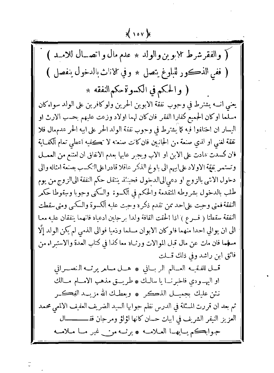 يعني أنه يشترط في وجوب نفقة الأبوين الحرين ولو كافرين على الولد سواء كان مسلمًا أو كان الجميع كفارًا الفقر فإن كان لهما أولاد وزعت عليهم بحسب الإرث أو اليسار إن اختلفوا فيه كما يشترط في وجوب نفقة الولد الحر على أبيه الحر عدم مال فلا نفقة لغني أو لذي صنعة من الجانبين فإن كانت صنعته لا تكفيه أعطي تمام الكفاية فإن كسدت عادت على الابن أو الأب ويجبر عليها بعدم الإنفاق إن امتنع من العمل وتستمر نفقة الأولاد على أبيهم إلى بلوغ الذكر عاقلًا قادرًا على التكسب بصنعة أمثاله وإلى دخول الأنثى بالزوج أو دعي إلى الدخول فحينئذ ينتقل حكم النفقة إلى الزوج من يوم طلب بالدخول بشروطه المتقدمة والحكم في الكسوة والسكنى وجوبًا وسقوطًا حكم النفقة فمتى وجبت على أحد ممن تقدم ذكره وجبت عليه الكسوة والسكنى ومتى سقطت النفقة سقطتا (فرع) إذا ألحقت القافة ولدًا برجلين ادعياه فإنهما ينفقان عليه معًا إلى أن يوالي أحدًا منهما فلو كان الأبوان مسلمًا وذميًا فوالي الذمي لم يكن الولد إلا مسلمًا فإن مات عن مال قبل الموالات ورثاه معًا كذا في كتاب العدة والاستبراء من فائق ابن راشد وفي ذلك قلت