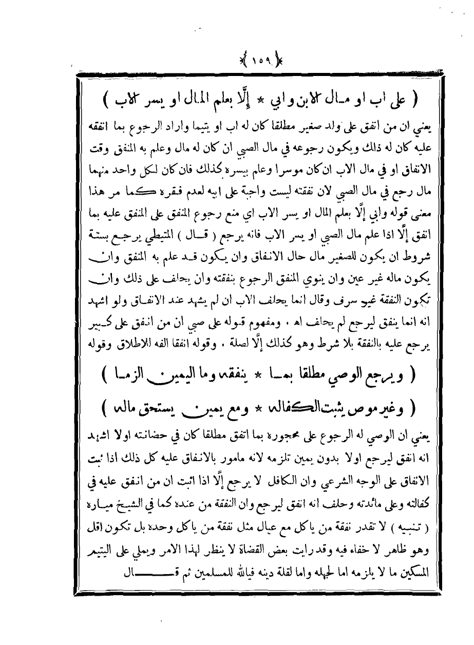يعني أن من أنفق على ولد صغير مطلقًا كان له أب أو يتيمًا وأراد الرجوع بما أنفقه عليه كان له ذلك ويكن في رجوعه في مال الصبي إن كان له مال وعلم به المنفق وقت الإنفاق أو في مال الأب إن كان موسرًا وعلم بيسره كذلك فإن كان لكل واحد منهما مال رجع في مال الصبي لأن نفقته ليست واجبة على أبيه لعدم فقره كما مر هذا معنى قوله وأبي إلا بعلم المال أو يسر الأب أي منع رجوع المنفق على المنفق عليه بما أنفق إلا إذا علم مال الصبي أو يسر الأب فإنه يرجع (قال) المتيطي يرجع بستة شروط أن يكون للصغير مال حال الإنفاق وأن يكون قد علم به المنفق وأن يكون ماله غير عين وأن ينوي المنفق الرجوع بنفقته وأن يحلف على ذلك وأن تكون النفقة غير سرف وقال إنما يحلف الأب إن لم يشهد عند الإنفاق ولو أشهد أنه إنما ينفق ليرجع لم يحلف اهـ. ومفهوم قوله على صبي أن من أنفق على كبير يرجع عليه بالنفقة بلا شرط وهو كذلك إلا لصلة. وقوله أنفقا ألفه للإطلاق وقوله