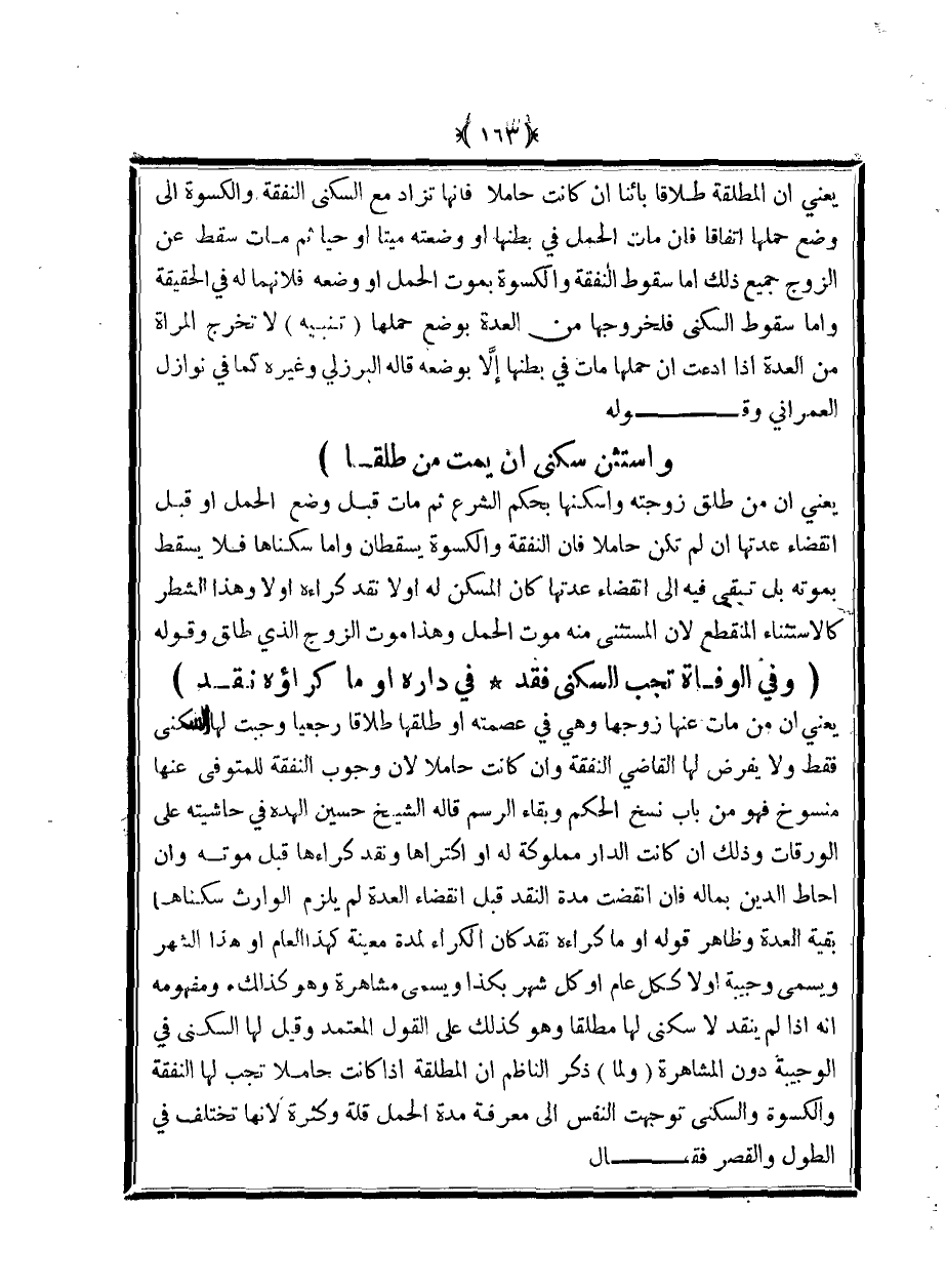 يعني أن من طلق زوجته وأسكنها بحكم الشرع ثم مات قبل وضع الحمل أو قبل انقضاء عدتها إن لم تكن حاملًا فإن النفقة والكسوة يسقطان وأما سكناها فلا يسقط بموته بل تبقى فيه إلى انقضاء عدتها كان المسكن له أو لا نقد كراءه أو لا وهذا الشطر كالاستثناء المنقطع لأن المستثنى منه موت الحمل وهذا موت الزوج الذي طلق وقوله