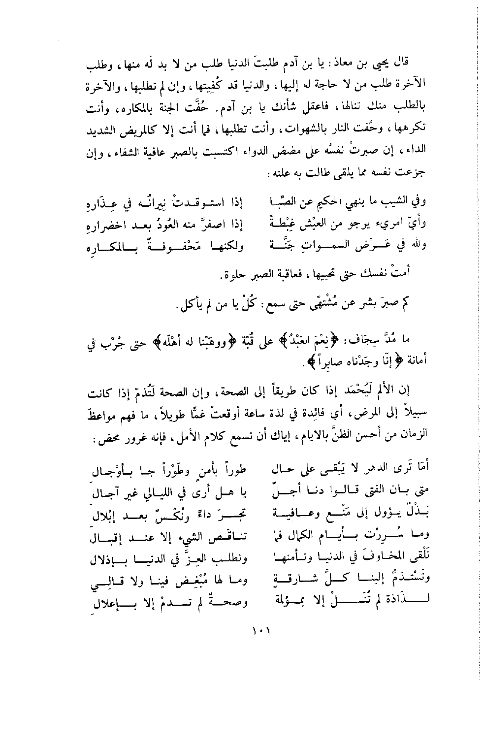 إِنَّ الأَلَمَ لَيُحْمَدُ إِذَا كَانَ طَرِيقًا إِلَى الصِّحَّةِ، وَإِنَّ الصِّحَّةَ لَتُذَمُّ إِذَا كَانَتْ سَبِيلا إِلَى الْمَرَضِ، أَيُّ فَائِدَةٍ فِي لَذَّةِ سَاعَةٍ أَوْقَعَتْ غَمًّا طَوِيلا، مَا فَهِمَ مَوَاعِظَ الزَّمَانِ مَنْ أَحْسَنَ الظَّنَّ بِالأَيَّامِ، إِيَّاكَ أَنْ تَسْمَعَ كَلامَ الأَمَلِ فَإِنَّهُ غُرُورٌ مَحْضٌ: