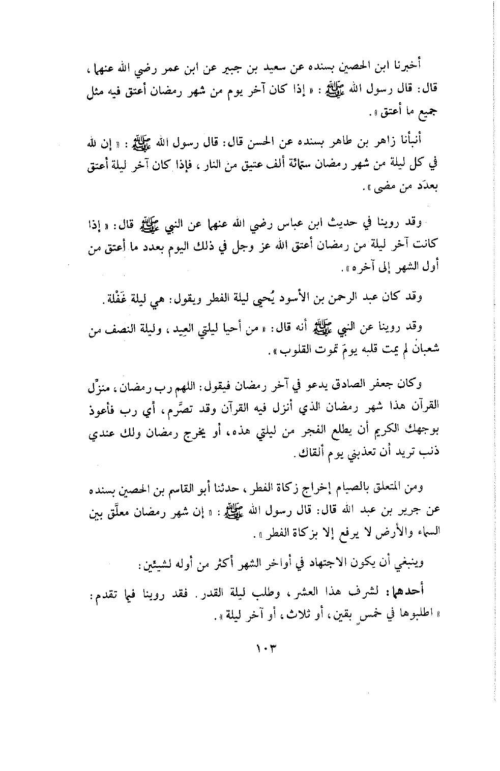 أَخْبَرَنَا ابْنُ الْحُصَيْنِ بِسَنَدِهِ عَنْ سَعِيدِ بْنِ جُبَيْرٍ عَنِ ابْنِ عُمَرَ رَضِيَ اللَّهُ عَنْهُمَا قَالَ قَالَ رَسُولُ اللَّهِ صَلَّى اللَّهُ عَلَيْهِ وَسَلَّمَ: " إِذَا كَانَ آخِرُ يَوْمٍ مِنْ شَهْرِ رَمَضَانَ أُعْتِقَ فِيهِ مِثْلُ جَمِيعِ مَا أُعْتِقَ " أَنْبَأَنَا زَاهِرُ بْنُ طَاهِرٍ بِسَنَدِهِ عَنِ الْحَسَنِ قَالَ: قَالَ رَسُولُ اللَّهِ صَلَّى اللَّهُ عَلَيْهِ وَسَلَّمَ " إِنَّ للَّهِ فِي كُلِّ لَيْلَةٍ مِنْ شهر رمضان ستمائة أَلْفِ عَتِيقٍ مِنَ النَّارِ، فَإِذَا كَانَ آخِرُ لَيْلَةٍ أَعْتَقَ بِعَدَدِ مَنْ مَضَى ".