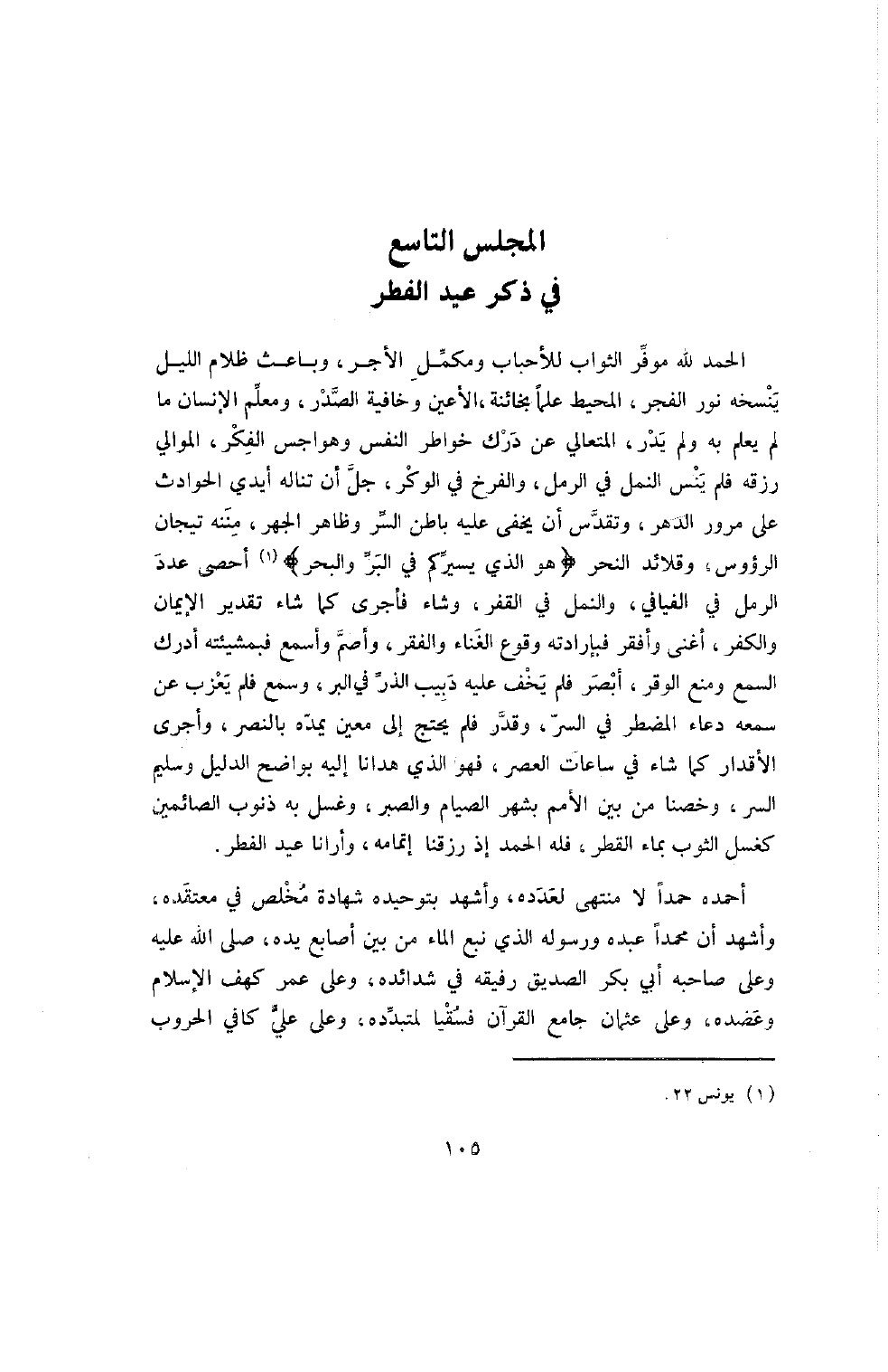 الْحَمْدُ للَّهِ مُوَفِّرِ الثَّوَابِ لِلأَحْبَابِ وَمُكْمِلِ الأَجْرِ، وَبَاعِثِ ظَلامِ اللَّيْلِ يَنْسَخُهُ نُورُ الْفَجْرِ، الْمُحِيطِ عِلْمًا بِخَائِنَةِ الأَعْيُنِ وَخَافِيَةِ الصَّدْرِ، وَمُعَلِّمِ الإِنْسَانِ مَا لَمْ يَعْلَمْ به ولم يدر، المتعلي عَنْ دَرَكِ خَوَاطِرِ النَّفْسِ وَهَوَاجِسِ الْفِكْرِ، الْمُوَالِي رِزْقَهُ فَلَمْ يَنْسَ النَّمْلَ فِي الرَّمْلِ وَالْفَرْخَ فِي الْوَكْرِ، جَلَّ أَنْ تَنَالَهُ أَيْدِي الْحَوَادِثِ عَلَى مُرُورِ الدَّهْرِ، وَتَقَدَّسَ أَنْ يَخْفَى عَلَيْهِ باطن السر وظاهر الجهر، مننه تيجان الرؤوس وَقَلائِدُ النَّحْرِ {هُوَ الَّذِي يُسَيِّرُكُمْ فِي الْبَرِّ والبحر} أَحْصَى عَدَدَ الرَّمْلِ فِي الْفَيَافِي وَالنَّمْلَ فِي الْقَفْرِ، وَشَاءَ فَأَجْرَى كَمَا شَاءَ تَقْدِيرَ الإِيمَانِ والكفر، أغنى وأفقر فبإرادته وُقُوعُ الْغِنَاءِ وَالْفَقْرِ، وَأَصَمَّ وَأَسْمَعَ فَبِمَشِيئَتِهِ أَدْرَكَ السَّمْعَ وَمُنِعَ الْوَقْرُ، أَبْصَرَ فَلَمْ يَخْفَ عَلَيْهِ دَبِيبُ الذَّرِّ فِي الْبَرِّ، وَسَمِعَ فَلَمْ يَعْزُبْ عَنْ سَمْعِهِ دُعَاءُ الْمُضْطَرِّ فِي السِّرِّ، وَقَدَرَ فَلَمْ يَحْتَجْ إِلَى مُعِينٍ يَمُدُّهُ بِالنَّصْرِ، وَأَجْرَى الأَقْدَارَ كَمَا شَاءَ فِي سَاعَاتِ الْعَصْرِ، فَهُوَ الَّذِي هَدَانَا إِلَيْهِ بِوَاضِحِ الدَّلِيلِ وَسَلِيمِ السِّرِّ، وَخَصَّنَا مِنْ بَيْنِ الأُمَمِ بِشَهْرِ الصِّيَامِ وَالصَّبْرِ، وَغَسَلَ بِهِ ذُنُوبَ الصَّائِمِينَ كَغَسْلِ الثَّوْبِ بِمَاءِ القطر، فله الحمد إذ رَزَقَنَا إِتْمَامَهُ وَأَرَانَا عِيدَ الْفِطْرِ.