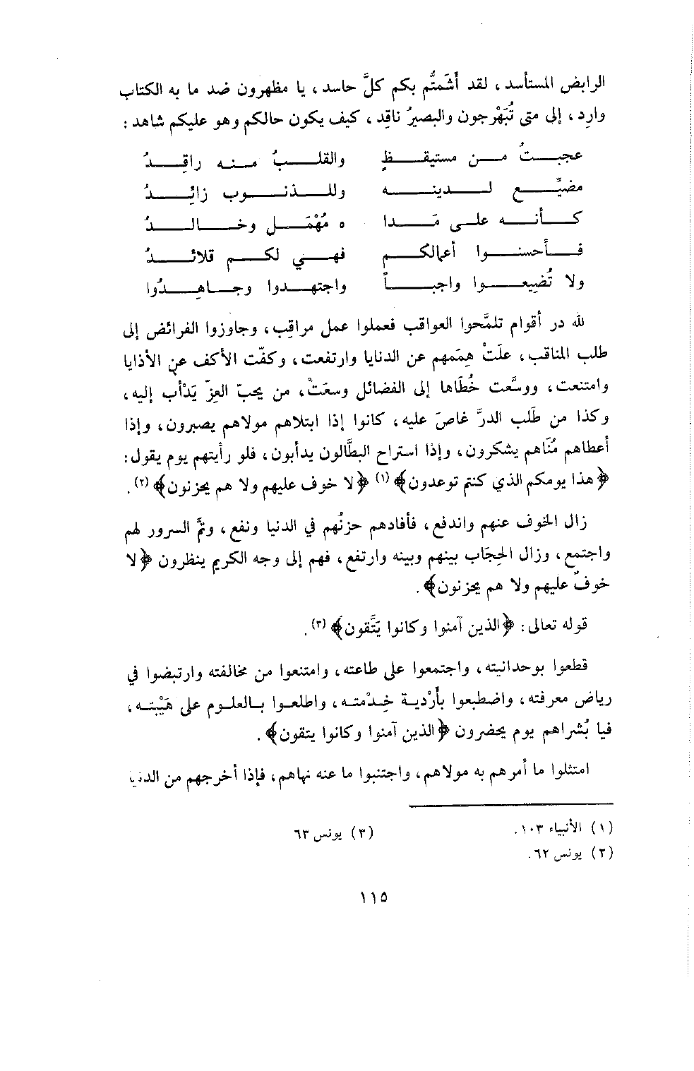 قَطَعُوا بِوَحْدَانِيَّتِهِ وَاجْتَمَعُوا عَلَى طَاعَتِهِ، وَامْتَنَعُوا مِنْ مخالفته وارتبضوا فِي رِيَاضِ مَعْرِفَتِهِ، وَاضْطَبَعُوا بِأَرْدِيَةِ خِدْمَتِهِ، وَاطَّلَعُوا بِالْعُلُومِ عَلَى هَيْبَتِهِ، فَيَا بُشْرَاهُمْ يَوْمَ يَحْضُرُونَ {الذين آمنوا وكانوا يتقون} .