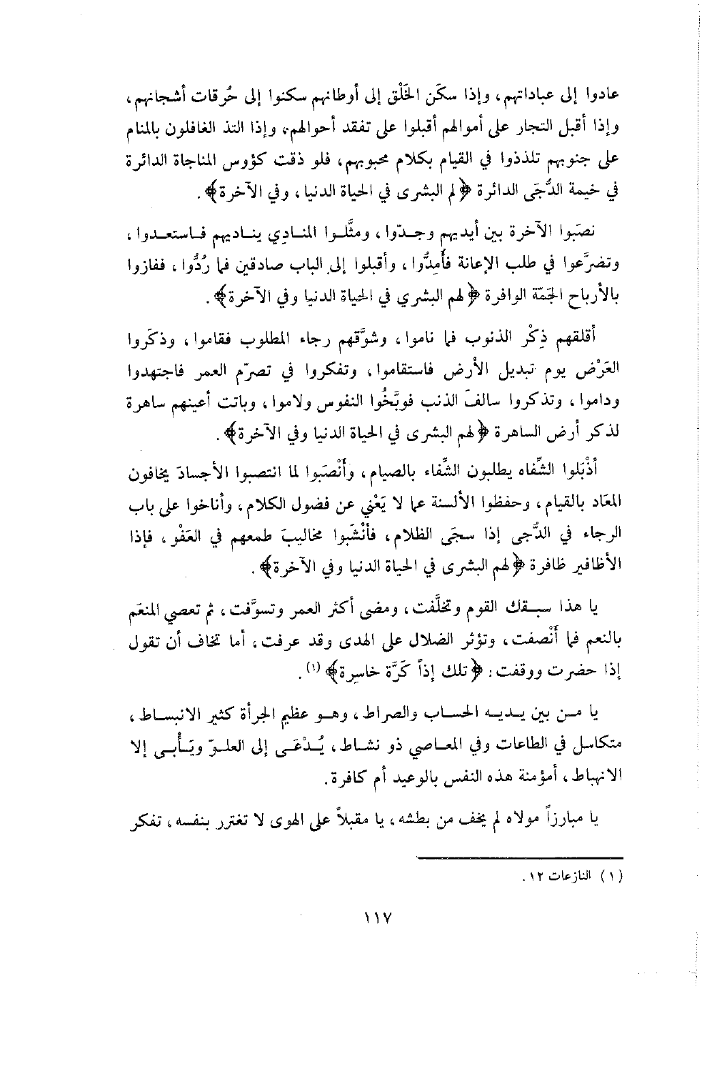 أَقْلَقَهُمْ ذِكْرُ الذُّنُوبِ فَمَا نَامُوا، وَشَوَّقَهُمْ رَجَاءُ الْمَطْلُوبِ فَقَامُوا، وَذَكَرُوا الْعَرْضَ يَوْمَ تَبْدِيلِ الأَرْضِ فَاسْتَقَامُوا، وَتَفَكَّرُوا فِي تَصَرُّمِ الْعُمْرِ فَاجْتَهَدُوا وَدَامُوا، وَتَذَكَّرُوا سَالِفَ الذَّنْبِ فَوَبَّخُوا النُّفُوسَ وَلامُوا، وَبَاتَتْ أَعْيُنُهُمْ سَاهِرَةً لِذِكْرِ أَرْضِ السَّاهِرَةِ {لَهُمُ الْبُشْرَى في الحياة الدنيا وفي الآخرة} .