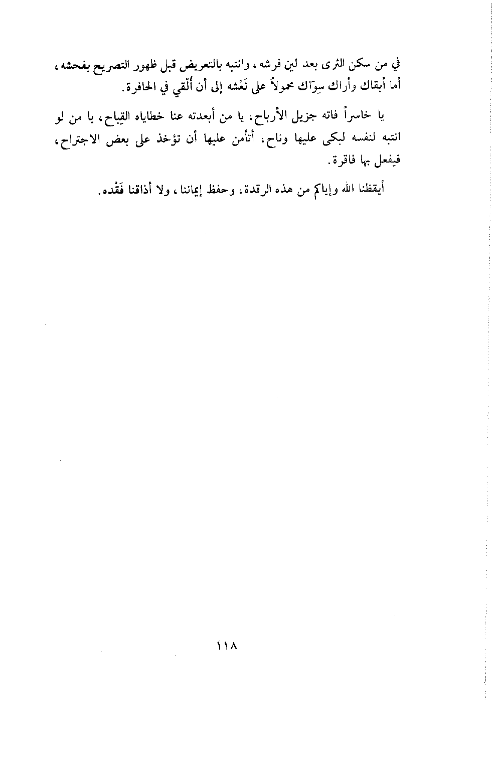 يَا خَاسِرًا فَاتَهُ جَزِيلُ الأَرْبَاحِ، يَا مَنْ أَبْعَدَتْهُ عَنَّا خَطَايَاهُ الْقِبَاحُ، يَا مَنْ لَوِ انْتَبَهَ لِنَفْسِهِ لَبَكَى عليها وَنَاحَ، أَتَأْمَنُ عَلَيْهَا أَنْ تُؤْخَذَ عَلَى بَعْضِ الاجْتِرَاحِ، فَيُفْعَلُ بِهَا فَاقِرَةٌ.