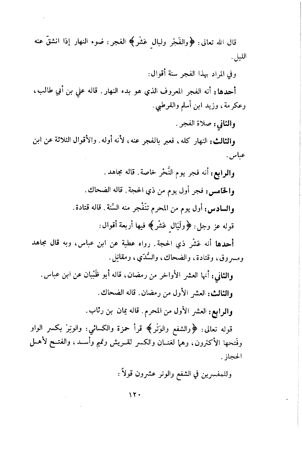 وَالأَقْوَالُ الثَّلاثَةُ عَنِ ابْنِ عَبَّاسٍ. وَالرَّابِعُ أَنَّهُ فَجْرُ يَوْمِ النَّحْرِ خَاصَّةً. قَالَهُ مُجَاهِدٌ وَالْخَامِسُ: فَجْرُ أَوَّلِ يَوْمٍ مِنْ ذِي الْحِجَّةِ. قَالَهُ الضَّحَّاكُ. وَالسَّادِسُ: أَوَّلُ يَوْمٍ مِنَ الْمُحَرَّمِ تَنْفَجِرُ مِنْهُ السَّنَةُ. قَالَهُ قَتَادَةُ.