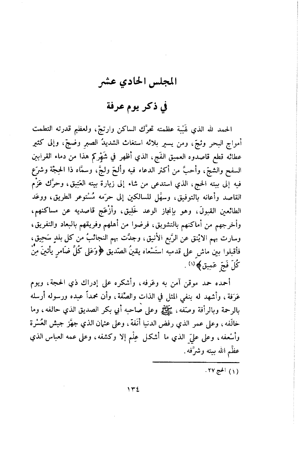 أَحْمَدُهُ حَمْدَ مُوقِنٍ آمِنٍ بِهِ وَعَرَفَهُ، وَأَشْكُرُهُ عَلَى إِدْرَاكِ ذِي الْحِجَّةِ وَيَوْمِ عَرَفَةَ، وَأَشْهَدُ لَهُ بِنَفْيِ الْمَثَلِ فِي الذَّاتِ وَالصِّفَةِ، وَأَنَّ مُحَمَّدًا عَبْدُهُ وَرَسُولُهُ أَرْسَلَهُ بِالرَّحْمَةِ وَبِالرَّأْفَةِ وَصَفَهُ، [صَلَّى اللَّهُ عَلَيْهِ وَسَلَّمَ] وَعَلَى صَاحِبِهِ أَبِي بَكْرٍ الصِّدِّيقِ الَّذِي حَالَفَهُ وَمَا خَالَفَهُ، وَعَلَى عُمَرَ الَّذِي رَفَضَ الدُّنْيَا أَنَفَةً، وَعَلَى عُثْمَانَ الَّذِي جَهَّزَ جَيْشَ الْعُسْرَةِ وَأَسْعَفَهُ، وَعَلَى عَلِيٍّ الَّذِي مَا أَشْكَلَ عِلْمٌ إِلا وَكَشَفَهُ، وَعَلَى عَمِّهِ الْعَبَّاسِ الَّذِي عَظَّمَ اللَّهُ بَيَتْهُ وَشَرَّفَهُ.