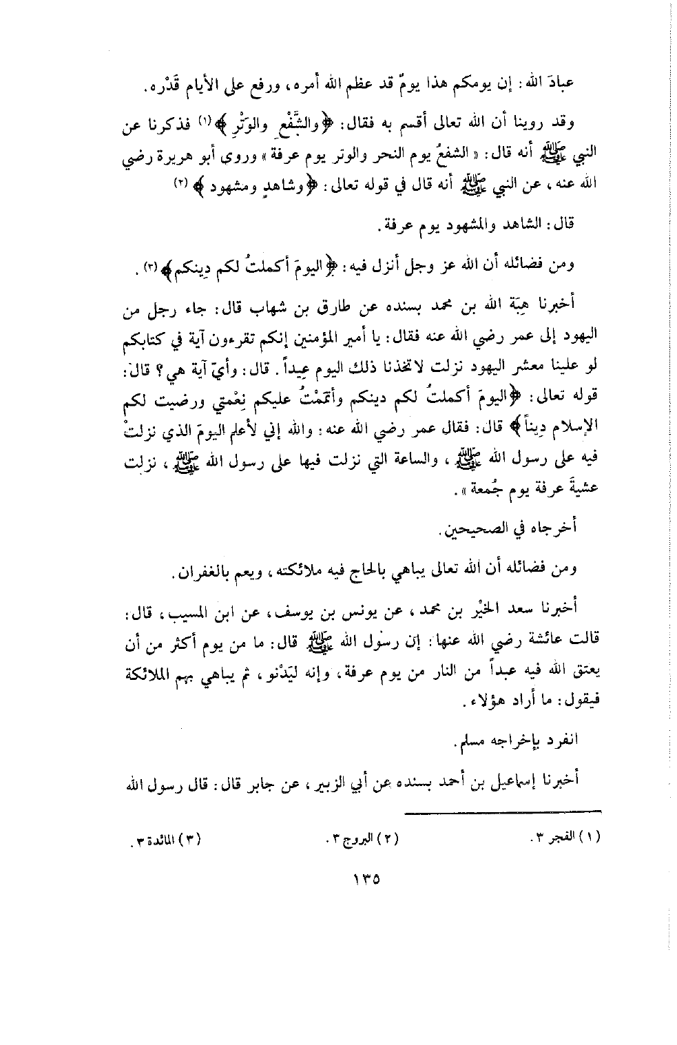 أَخْبَرَنَا هِبَةُ اللَّهِ بْنُ مُحَمَّدٍ بِسَنَدِهِ عَنْ طَارِقِ بْنِ شِهَابٍ قَالَ: جَاءَ رَجُلٌ مِنَ الْيَهُودِ إِلَى عُمَرَ رَضِيَ اللَّهُ عَنْهُ فَقَالَ: يا أمير المؤمنين إنكم تقرؤون آيَةً فِي كِتَابِكُمْ لَوْ عَلَيْنَا مَعْشَرَ الْيَهُودِ نَزَلَتْ لاتَّخَذْنَا ذَلِكَ الْيَوْمَ عِيدًا. قَالَ: وَأَيُّ آيَةٍ هِيَ؟ قَالَ: قَوْلُهُ تَعَالَى: {الْيَوْمَ أَكْمَلْتُ لَكُمْ دِينَكُمْ وَأَتْمَمْتُ عَلَيْكُمْ نِعْمَتِي وَرَضِيتُ لَكُمُ الإسلام دينا} قَالَ: فَقَالَ عُمَرُ رَضِيَ اللَّهُ عَنْهُ: وَاللَّهِ إِنِّي لأَعْلَمُ الْيَوْمَ الَّذِي نَزَلَتْ فِيهِ عَلَى رَسُولِ اللَّهِ صَلَّى اللَّهُ عَلَيْهِ وَسَلَّمَ وَالسَّاعَةَ الَّتِي نَزَلَتْ فِيهَا عَلَى رَسُولِ اللَّهِ صَلَّى اللَّهُ عَلَيْهِ وَسَلَّمَ، نَزَلَتْ عَشِيَّةَ عَرَفَةَ يَوْمَ جُمُعَةٍ.