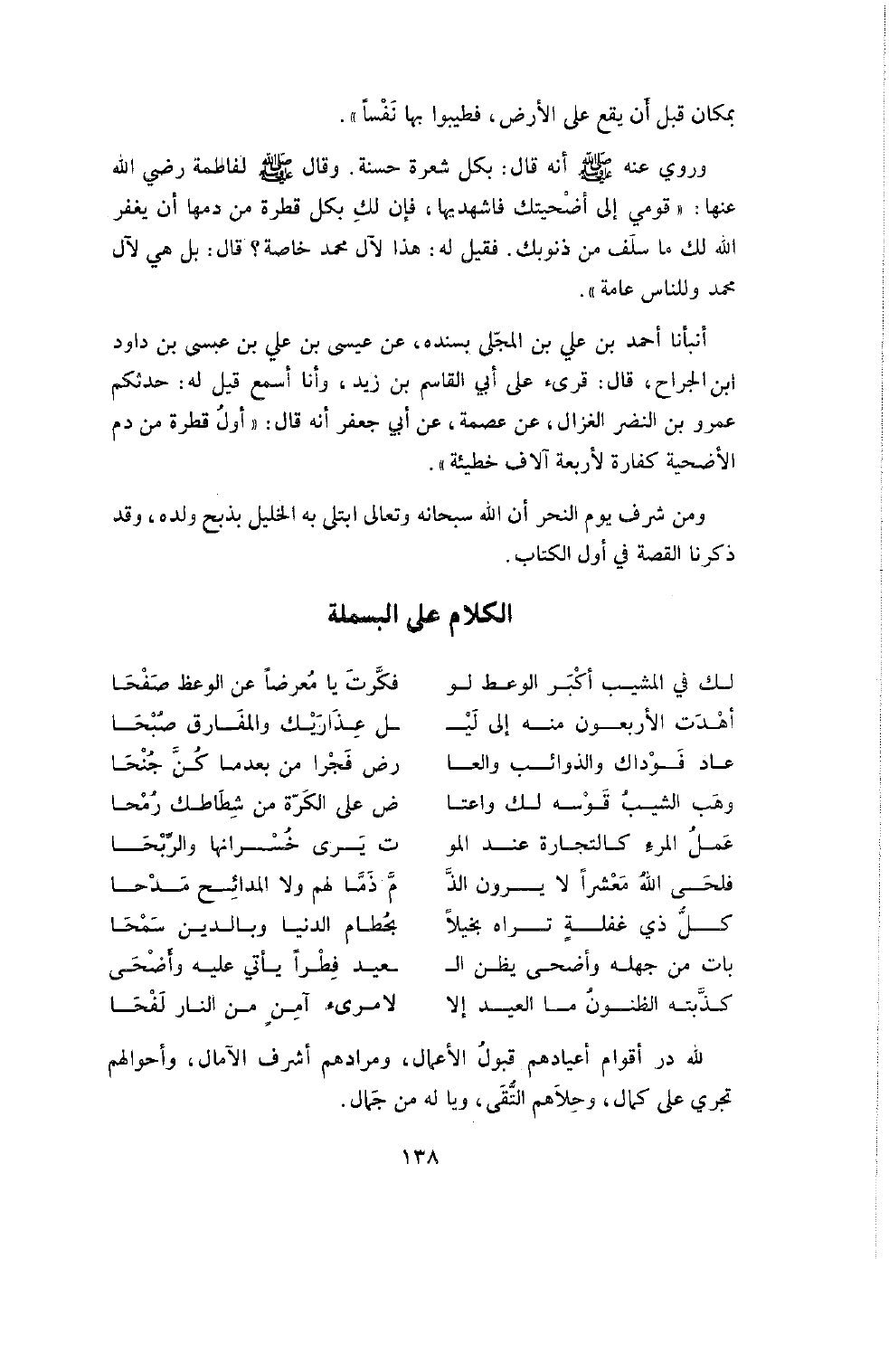 وَرُوِيَ عَنْهُ صَلَّى اللَّهُ عَلَيْهِ وَسَلَّمَ أَنَّهُ قَالَ: بِكُلِّ شَعْرَةٍ حَسَنَةٌ. وَقَالَ صَلَّى اللَّهُ عَلَيْهِ وَسَلَّمَ لِفَاطِمَةَ رَضِيَ اللَّهُ عَنْهَا: " قُومِي إِلَى أُضْحِيَتِكَ فَاشْهَدِيهَا فَإِنَّ لَكِ بِكُلِّ قَطْرَةٍ مِنْ دَمِهَا أَنْ يَغْفِرَ اللَّهُ لَكِ مَا سَلَفَ مِنْ ذُنُوبِكَ. فَقِيلَ لَهُ: هَذَا لآلِ مُحَمَّدٍ خَاصَّةً؟ قَالَ بَلْ هِيَ لآلِ مُحَمَّدٍ وَلِلنَّاسِ عَامَّةً ".