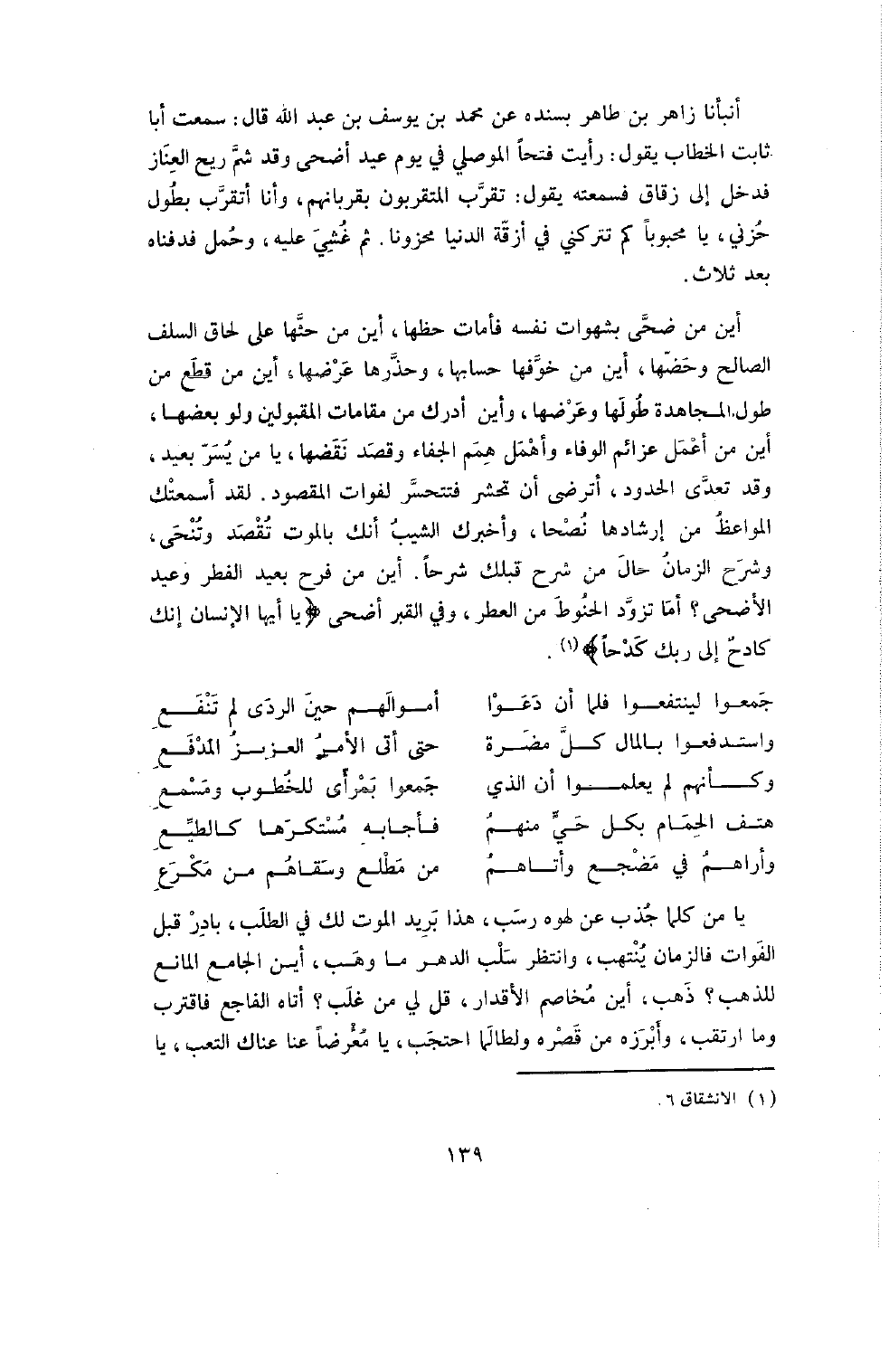 أَيْنَ مَنْ ضَحَّى بِشَهَوَاتِ نَفْسِهِ فَأَمَاتَ حَظَّهَا، أَيْنَ مَنْ حَثَّهَا عَلَى لِحَاقِ السَّلَفِ الصَّالِحِ وَحَضَّهَا، أَيْنَ مَنْ خَوَّفَهَا حِسَابَهَا وَحَذَّرَهَا عَرَضَهَا، أَيْنَ مَنْ قَطَعَ مِنْ طُولِ الْمُجَاهَدَةِ طُولَهَا وَعَرْضَهَا، وَأَيْنَ مَنْ أَدْرَكَ مِنْ مَقَامَاتِ الْمَقْبُولِينَ وَلَوْ بَعْضَهَا، أَيْنَ مَنْ أَعْمَلَ عَزَائِمَ الْوَفَاءِ وَأَهْمَلَ هِمَمَ الْجَفَاءِ وَقَصَدَ نَقْضَهَا، يَا مَنْ يُسَرُّ بِعِيدٍ وَقَدْ تَعَدَّى الْحُدُودَ، أَتَرْضَى أَنْ تُحْشَرَ فَتَتَحَسَّرَ لِفَوَاتِ الْمَقْصُودِ. لَقَدْ أَسْمَعَتْكَ الْمَوَاعِظُ مِنْ إِرْشَادِهَا نُصْحًا، وَأَخْبَرَكَ الشَّيْبُ أَنَّكَ بِالْمَوْتِ تُقْصَدُ وَتُنْحَى، وَشَرَحَ الزَّمَانُ حَالَ مَنْ شَرَحَ قَبْلَكَ شَرْحًا. أَيْنَ مَنْ فَرِحَ بِعِيدِ