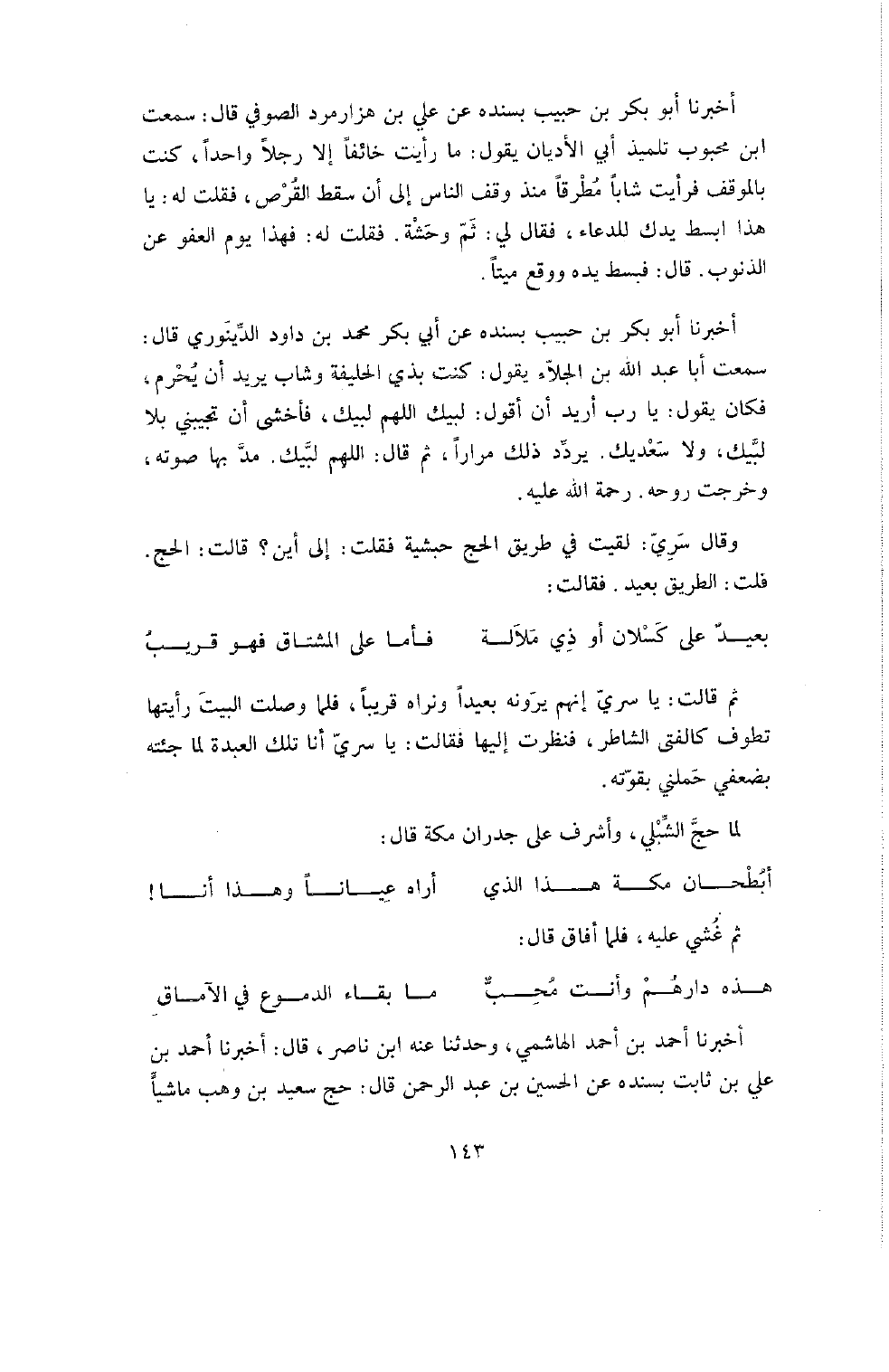 ثُمَّ قَالَتْ: يَا سَرِيُّ إِنَّهُمْ يَرَوْنَهُ بَعِيدًا ونراه قريبا. فَلَمَّا وَصَلَتِ الْبَيْتَ رَأَيْتُهَا تَطُوفُ كَالْفَتَى الشَّاطِرِ، فَنَظَرْتُ إِلَيْهَا فَقَالَتْ: يَا سَرِيُّ أَنَا تِلْكَ الْعَبْدَةُ لَمَّا جِئْتُهُ بِضَعْفِي حَمَلَنِي بِقُوَّتِهِ، لَمَّا حَجَّ الشِّبْلِيُّ وَأَشْرَفَ عَلَى جُدْرَانِ مَكَّةَ قَالَ: