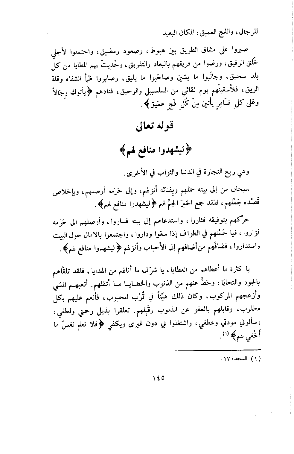 وَرَضُوا مِنْ فَرِيقِهِمْ بِالْبِعَادِ وَالتَّفْرِيقِ، وَحَدِيَتْ بِهِمُ الْمَطَايَا مِنْ كُلِّ بَلَدٍ سَحِيقٍ، وَجَانَبُوا مَا يَشِينُ وَصَاحَبُوا مَا يَلِيقُ، وَصَابَرُوا ظَمَأَ الشِّفَاهِ وَقِلَّةَ الرِّيقِ، فَلأُسْقِيَنَّهُمْ يَوْمَ لِقَائِي مِنَ السَّلْسَبِيلِ وَالرَّحِيقِ، فَنَادِهِمْ {يَأْتُوكَ رِجَالا وَعَلَى كُلِّ ضَامِرٍ يَأْتِينَ مِنْ كُلِّ فَجٍّ عميق} قوله تعالى {ليشهدوا منافع لهم} وَهِيَ رِبْحُ التِّجَارَةِ فِي الدُّنْيَا وَالثَّوَابُ فِي الأُخْرَى.