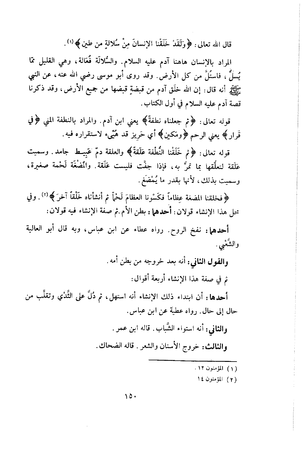 قوله تعالى: {ثم خلقنا النطقة علقة} والعلقة دم عبيط جامد. وسميت علقة لِتَعَلُّقِهَا بِمَا تَمُرُّ بِهِ، فَإِذَا جَفَّتْ فَلَيْسَتْ علقة. والمضغة لَحْمَةً صَغِيرَةً، وَسُمِّيَتْ بِذَلِكَ لأَنَّهَا بِقَدْرِ مَا يُمْضَغُ.