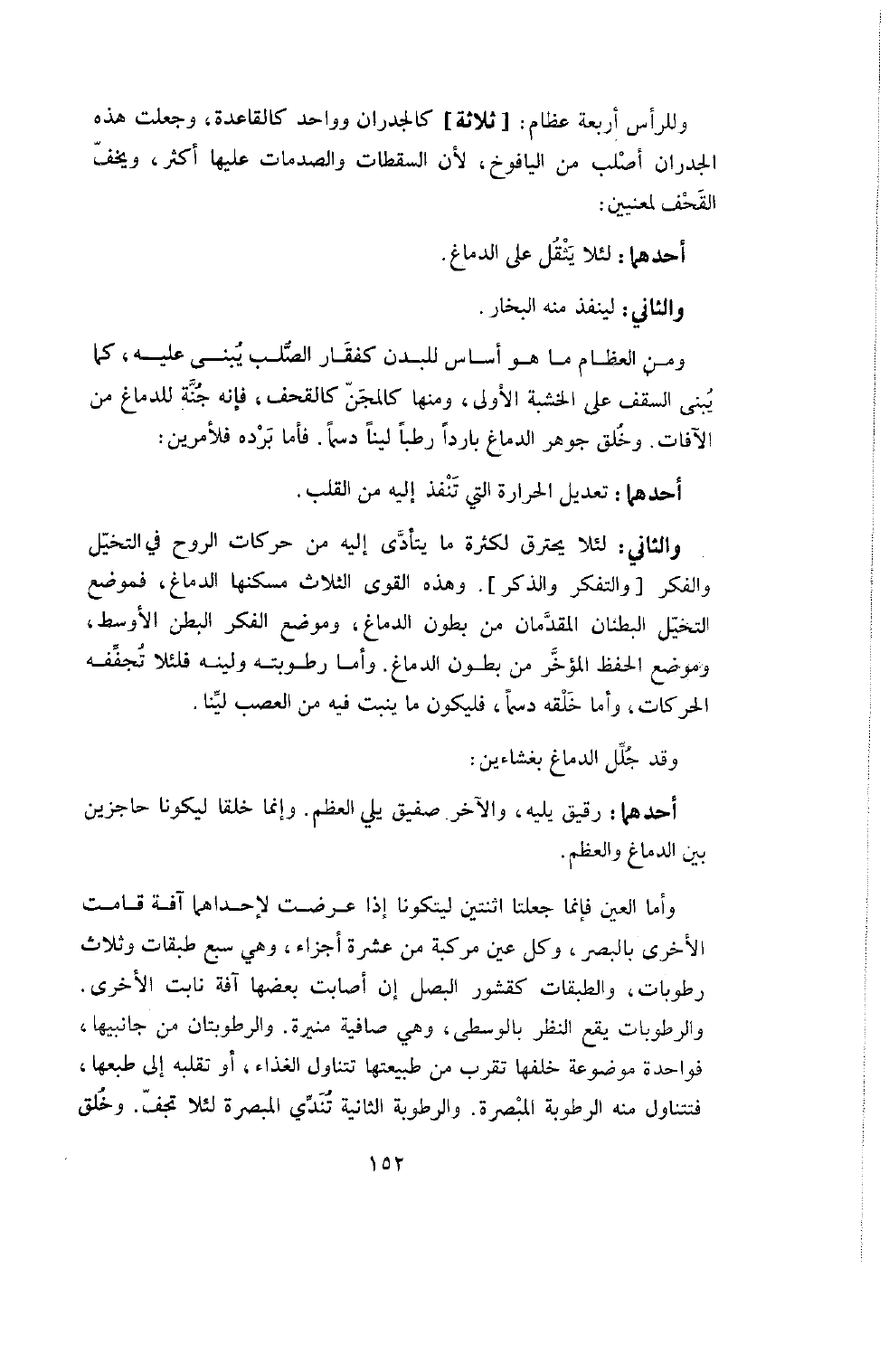وَمِنَ الْعِظَامِ مَا هُوَ أَسَاسٌ لِلْبَدَنِ كَفِقَارِ الصُّلْبِ يُبْنَى عَلَيْهِ كَمَا يُبْنَى السَّقْفُ عَلَى الْخَشَبَةِ الأُولَى، وَمِنْهَا كَالْمِجَنِّ كَالْقِحْفِ فَإِنَّهُ جُنَّةٌ لِلدِّمَاغِ مِنَ الآفَاتِ. وَخُلِقَ جَوْهَرُ الدِّمَاغِ بَارِدًا رَطْبًا لَيِنًّا دَسْمًا. فَأَمَّا بَرْدُهُ فَلأَمْرَيْنِ: أَحَدُهُمَا تَعْدِيلُ الْحَرَارَةِ الَّتِي تَنْفُذُ إِلَيْهِ مِنَ الْقَلْبِ. وَالثَّانِي: لِئَلا يَحْتَرِقَ لِكَثْرَةِ مَا يَتَأَدَّى إِلَيْهِ مِنْ حَرَكَاتِ الرُّوحِ فِي التَّخَيُّلِ وَالْفِكْرِ [وَالتَّفَكُّرِ وَالذِّكْرِ] . وَهَذِهِ الْقُوَى الثَّلاثُ مَسْكَنُهَا الدِّمَاغُ فَمَوْضِعُ التَّخَيُّلِ الْبَطْنَانِ الْمُقَدَّمَانِ مِنْ بُطُونِ الدِّمَاغِ، وَمَوْضِعُ الْفِكْرِ الْبَطْنُ الأَوْسَطُ، وَمَوْضِعُ الْحِفْظِ الْمُؤَخَّرُ مِنْ بُطُونِ الدِّمَاغِ. وَأَمَّا رُطُوبَتُهُ وَلِينُهُ فَلِئَلا تُجَفِّفَهُ الْحَرَكَاتُ، وَأَمَّا خَلْقُهُ دَسْمًا فَلِيَكُونَ مَا يَنْبُتُ فِيهِ مِنَ الْعَصَبِ لَيِّنًا.