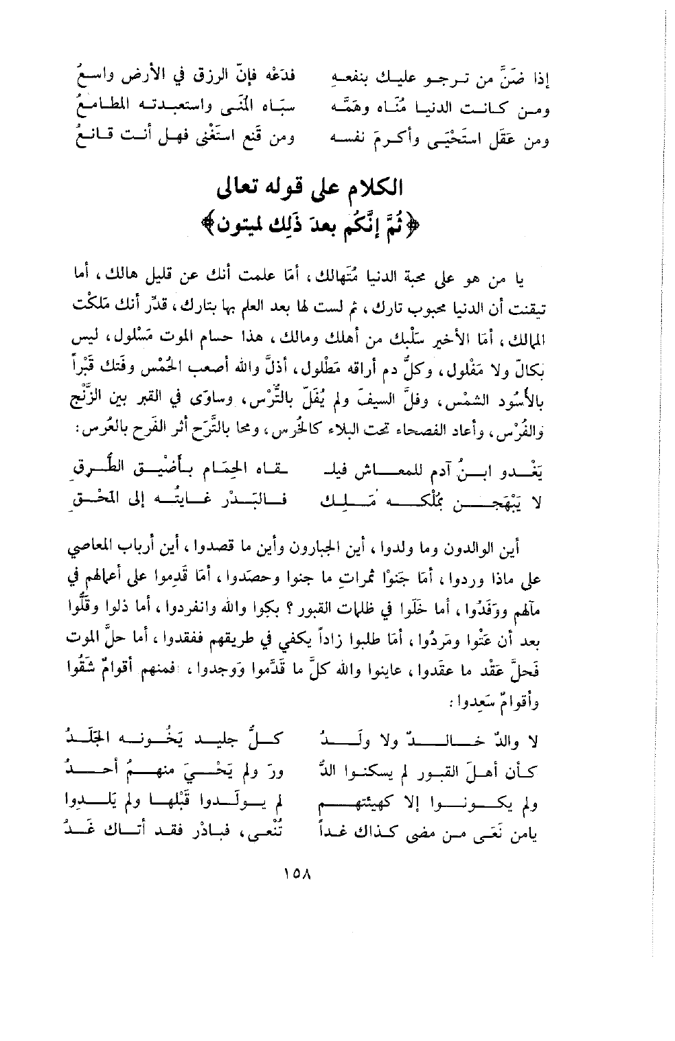 {ثم إنكم بعد ذلك لميتون} يَا مَنْ هُوَ عَلَى مَحَبَّةِ الدُّنْيَا مُتَهَالِكٌ، أَمَا عَلِمْتَ أَنَّكَ عَنْ قَلِيلٍ هَالِكٌ، أَمَا تَيَقَّنْتَ أَنَّ الدُّنْيَا مَحْبُوبٌ تَارِكٌ، ثُمَّ لَسْتَ لَهَا بَعْدَ الْعِلْمِ بِهَا بِتَارِكٍ، قَدِّرْ أَنَّكَ مَلَكْتَ الْمَمَالِكَ، أَمَا الأَخِيرُ سَلَبَكَ مِنْ أَهْلِكَ وَمَالِكَ، هَذَا حُسَامُ الْمَوْتِ مَسْلُولٌ، لَيْسَ بِكَالٍّ وَلا مَفْلُولٍ، وَكُلُّ دَمٍ أَرَاقَهُ مَطْلُولٌ، أَذَلَّ وَاللَّهِ أَصْعَبَ الْحَمْسِ وَفَتَكَ قَبْرًا بِالأَسْوَدِ الشَّمْسِ، وَفَلَّ