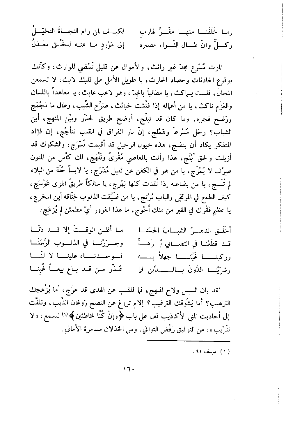 الْحَذَرِ وَبَيْنَ الْمَنْهَجِ، أَيْنَ الشَّبَابُ؟ رَحَلَ مُسْرِعًا وَهَمْلَجَ، إِنَّ نَارَ الْفِرَاقِ فِي الْقَلْبِ تَتَأَجَّجَ، إِنَّ فُؤَادَ الْمُتَفَكِّرِ يَكَادُ أَنْ يَنْضَجُ، هَذِهِ خُيُولُ الرَّحِيلِ قَدْ أُقِيمَتْ تُسْرَجُ، وَالشُّكُوكُ قَدْ أُزِيلَتْ وَالْحَقُّ أَبْلَجُ، هَذَا وَأَنْتَ بِالْمَعَاصِي مُغْرًى وَتَلْهَجُ، لَكَ كَأْسٌ مِنَ الْمَنُونِ صَرْفٌ لا يُمْزَجُ، يَا مَنْ هُوَ فِي الْكَفَنِ عَنْ قَلِيلٍ مُدْرَجٌ، يَا لابِسًا حُلَّةً مِنَ الْبَلاءِ لَمْ تُنْسَجْ، يَا مَنْ بِضَاعَتُهُ إِذَا نُقِدَتْ كُلُّهَا بَهْرَجٌ، يَا سَالِكًا طَرِيقُ الْهَوَى عَوْسَجٌ، كَيْفَ الطَّمَعُ فِي الْمُرْتَجَى وَالْبَابُ مُرْتَجٌّ، يَا مَنْ ضَيَّقَتِ الذُّنُوبُ خِنَاقَهُ أَيْنَ الْمَخْرَجُ، يَا عَظِيمَ فَقْرِكَ فِي الْقَبْرِ مَنْ مِنْكَ أَحْوَجُ، مَا هَذَا الْغُرُورُ أَيُّ مُطْمَئِنٍّ لَمْ يُزْعَجْ: