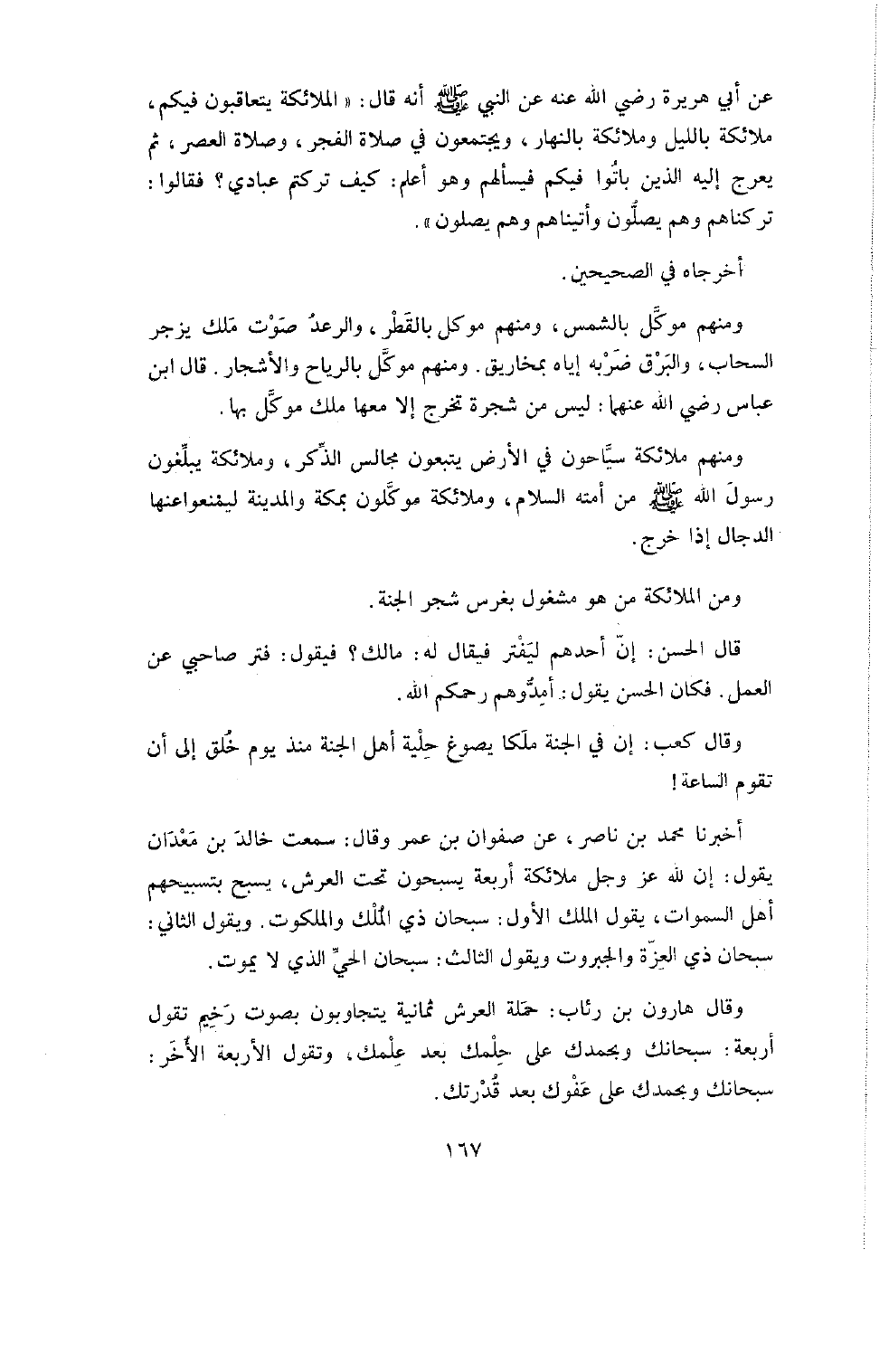 عَنْ أَبِي هُرَيْرَةَ رَضِيَ اللَّهُ عَنْهُ عَنِ النَّبِيِّ صَلَّى اللَّهُ عَلَيْهِ وَسَلَّمَ أَنَّهُ قَالَ: " الْمَلائِكَةُ يَتَعَاقَبُونَ فِيكُمْ، مَلائِكَةٌ بِاللَّيْلِ وَمَلائِكَةٌ بِالنَّهَارِ، وَيَجْتَمِعُونَ فِي صَلاةِ الْفَجْرِ وَصَلاةِ الْعَصْرِ، ثُمَّ يَعْرُجُ إِلَيْهِ الَّذِينَ بَاتُوا فِيكُمْ فَيَسْأَلُهُمْ وَهُوَ أَعْلَمُ: كَيْفَ تَرَكْتُمْ عِبَادِي؟ فَقَالُوا تَرَكْنَاهُمْ وَهُمْ يُصَلُّونَ وَأَتَيْنَاهُمْ وَهُمْ يُصَلُّونَ ".