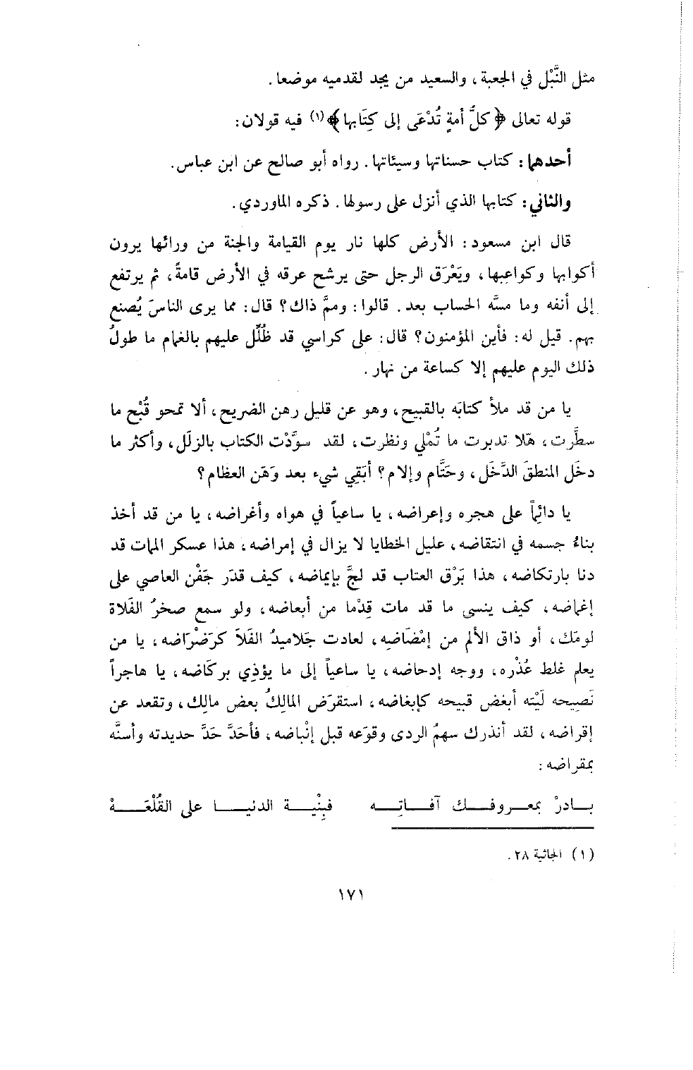يَا مَنْ قَدْ مَلأَ كِتَابَهُ بِالْقَبِيحِ وَهُوَ عَنْ قَلِيلٍ رَهْنَ الضَّرِيحِ، أَلا تَمْحُو قُبْحَ مَا سَطَّرْتَ، هَلا تَدَبَّرْتَ مَا تُمْلِي وَنَظَرْتَ، لَقَدْ سَوَّدْتَ الْكِتَابَ بِالزَّلَلِ، وَأَكْثَرُ مَا دَخَلَ الْمَنْطِقَ الدَّخَلُ، وَحَتَّامَ وَإِلامَ؟ أَبَقِيَ شَيْءٌ بَعْدَ وَهَنِ الْعِظَامِ؟