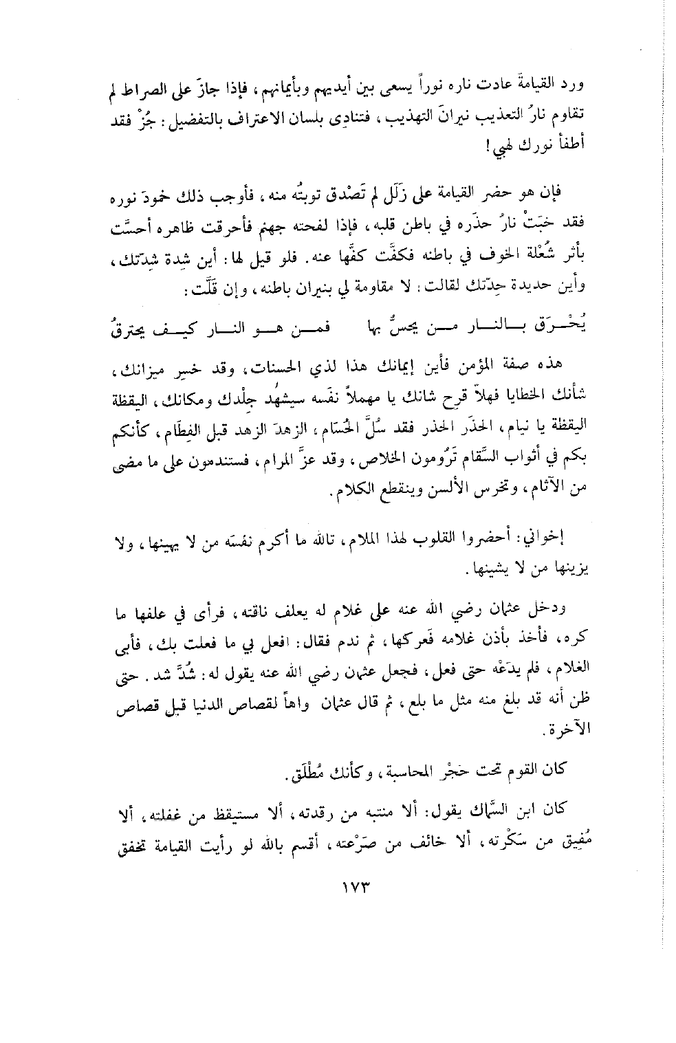 فَهَلا قَرْحٌ شَانَكَ يَا مُهْمِلا نَفْسَهُ سَيَشْهَدُ جِلْدُكَ وَمَكَانُكَ، الْيَقَظَةَ الْيَقَظَةَ يَا نِيَامُ، الْحَذَرَ الْحَذَرَ فَقَدْ سُلَّ الْحُسَامُ، الزُّهْدَ الزُّهْدَ قَبْلَ الْفِطَامِ، كَأَنَّكُمْ بِكُمْ فِي أَثْوَابِ السِّقَامِ تَرُومُونَ الْخَلاصَ وَقَدْ عَزَّ الْمَرَامُ، فَسَتَنْدَمُونَ عَلَى مَا مَضَى مِنَ الآثَامِ، وَتَخْرَسُ الأَلْسُنُ وَيَنْقَطِعُ الْكَلامُ.