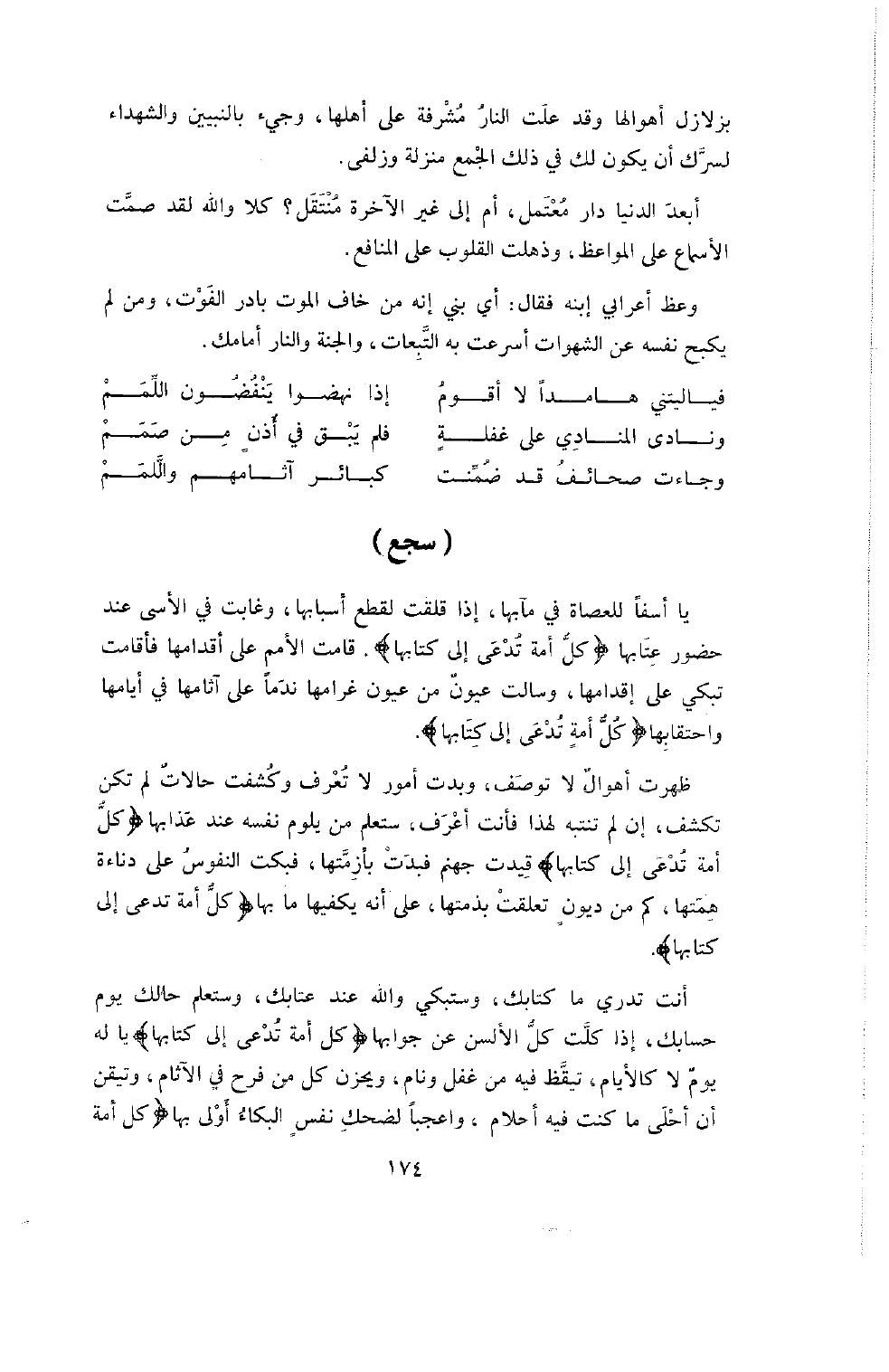 ظَهَرَتْ أَهْوَالٌ لا تُوصَفُ، وَبَدَتْ أُمُورٌ لا تُعْرَفُ، وَكُشِفَ حَالاتٌ لَمْ تَكُنْ تُكْشَفُ، إِنْ لَمْ تَنْتَبِهْ لِهَذَا فَأَنْتَ أَعْرَفُ، سَتَعْلَمُ مَنْ يَلُومُ نَفْسَهُ عِنْدَ عَذَابِهَا {كُلُّ أُمَّةٍ تُدْعَى إلى كتابها} قُيِّدَتْ جَهَنَّمُ فَبَدَتْ بِأَزِمَّتِهَا، فَبَكَتِ النُّفُوسُ عَلَى دَنَاءَةِ هِمَّتِهَا، كَمْ مِنْ دُيُونٍ تَعَلَّقَتْ بِذِمَّتِهَا، عَلَى أَنَّهُ يَكْفِيهَا مَا بِهَا {كُلُّ أُمَّةٍ تدعى إلى كتابها} .