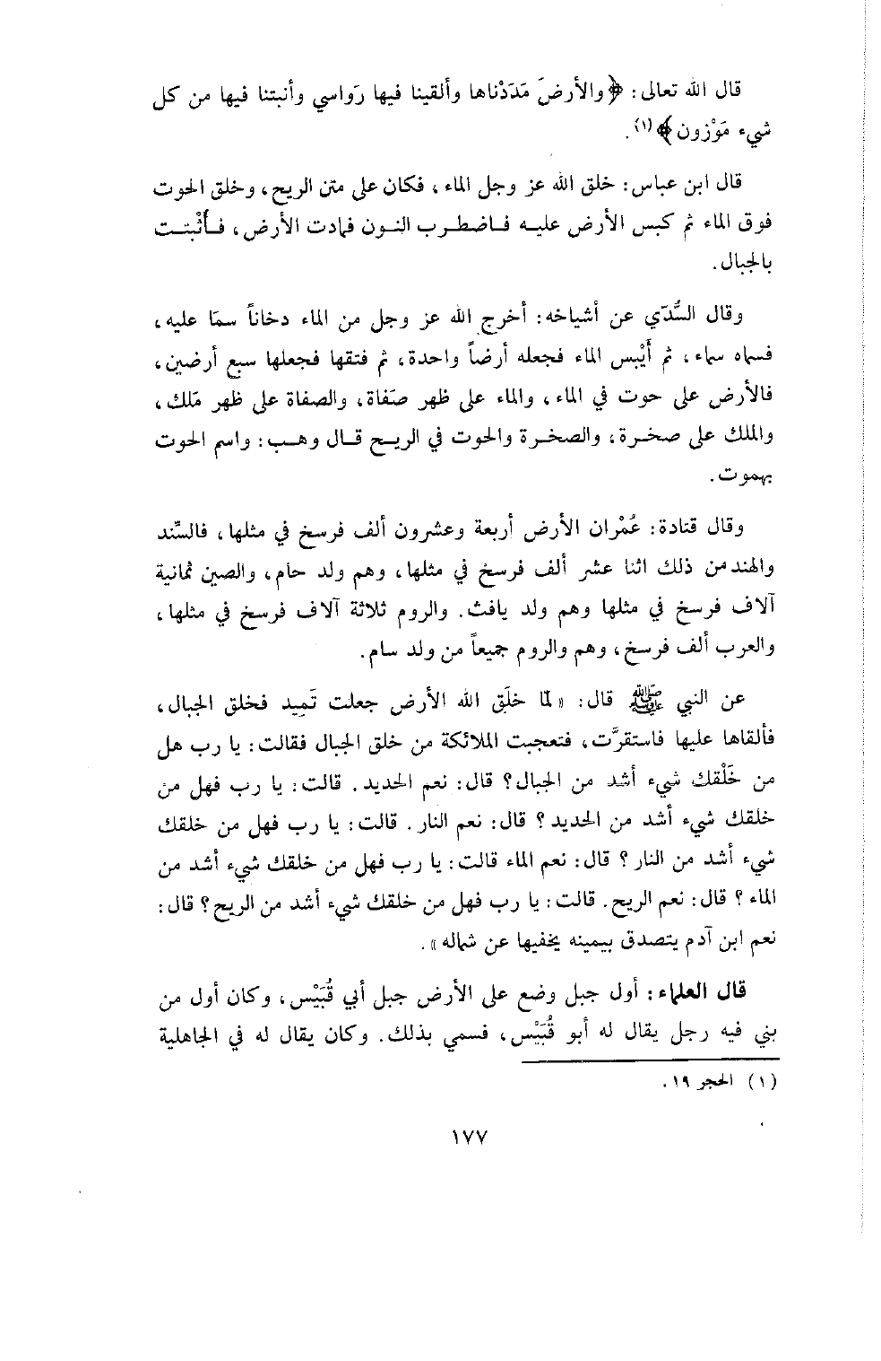 قَالَ ابْنُ عَبَّاسٍ: خَلَقَ اللَّهُ عَزَّ وَجَلَّ الْمَاءَ فَكَانَ عَلَى مَتْنِ الرِّيحِ، وَخَلَقَ الْحُوتَ فَوْقَ الْمَاءِ ثُمَّ كَبَسَ الأَرْضَ عَلَيْهِ فَاضْطَرَبَ النُّونُ فَمَادَتِ الأَرْضُ، فَأُثْبِتَتْ بِالْجِبَالِ.