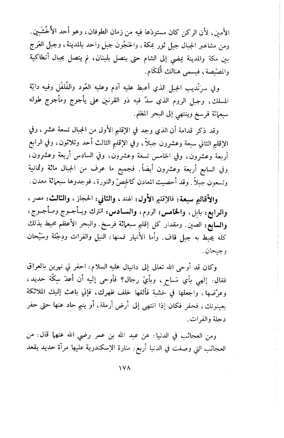 وَالأَقَالِيمُ سَبْعَةٌ: فَالإِقْلِيمُ الأَوَّلُ: الْهِنْدُ، وَالثَّانِي: الْحِجَازُ، وَالثَّالِثُ: مِصْرُ، وَالرَّابِعُ بَابِلُ، وَالْخَامِسُ: الرُّومُ، وَالسَّادِسُ التُّرْكُ وَيَأْجُوجُ وَمَأْجُوجُ، وَالسَّابِعُ: الصِّينُ وَمِقْدَارُ كل إقليم سبعمائة فَرْسَخٍ. وَالْبَحْرُ الأَعْظَمُ مُحِيطٌ بِذَلِكَ كُلِّهِ يُحِيطُ بِهِ جَبَلُ قَافٍ. وَأَمَّا الأَنْهَارُ فَمِنْهَا النِّيلُ وَالْفُرَاتُ وَدِجْلَةُ وَسَيْحَانُ وَجَيْحَانُ.