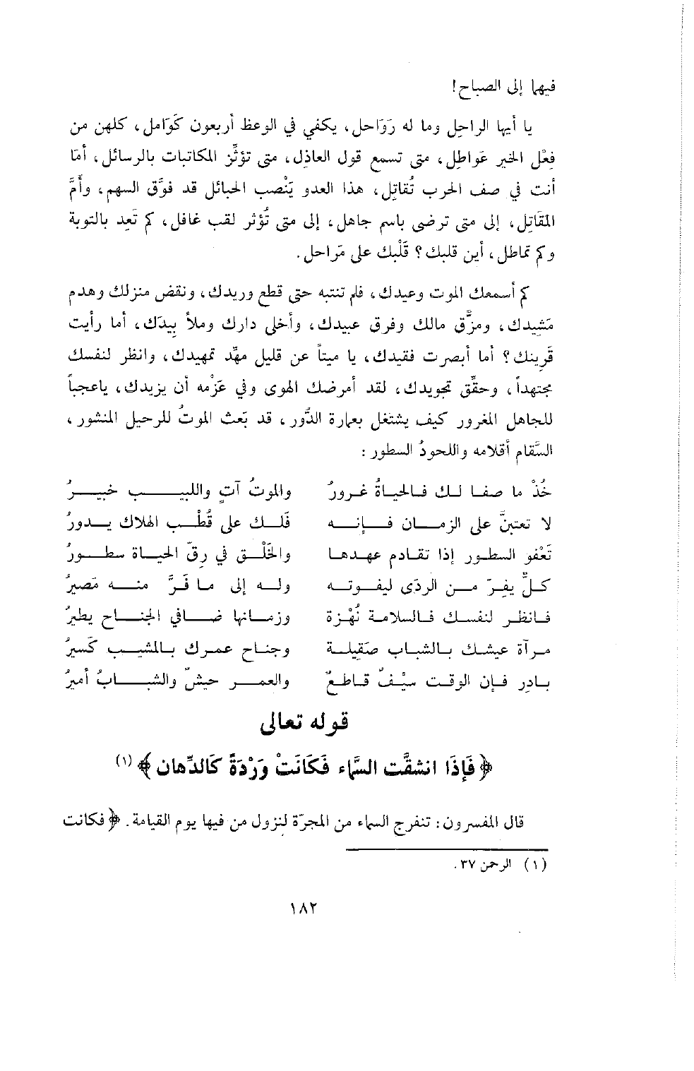 يا أيها الرَّاحِلُ وَمَا لَهُ رَوَاحِلُ، يَكْفِي فِي الْوَعْظِ أَرْبَعُونَ كَوَامِلَ، كُلُّهُنَّ مِنْ فِعْلِ الْخَيْرِ عَوَاطِلُ، مَتَى تَسْمَعُ قَوْلَ الْعَاذِلِ، مَتَى تُؤْثِرُ الْمُكَاتَبَاتِ بِالرَّسَائِلِ، أَمَا أَنْتَ فِي صَفِّ الْحَرْبِ تُقَاتِلُ، هَذَا الْعَدُوُّ يَنْصُبُ الْحَبَائِلَ قَدْ فُوِّقَ السَّهْمُ وَأَمَّ الْمُقَاتِلُ، إِلَى مَتَى تَرْضَى بِاسْمِ جَاهِلٍ، إِلَى مَتَى تُؤْثِرُ لَقَبَ غَافِلٍ، كَمْ تَعِدُ بِالتَّوْبَةِ وَكَمْ تُمَاطِلُ، أَيْنَ قَلْبُكَ؟ قَلَبَكَ عَلَى مَرَاحِلَ.