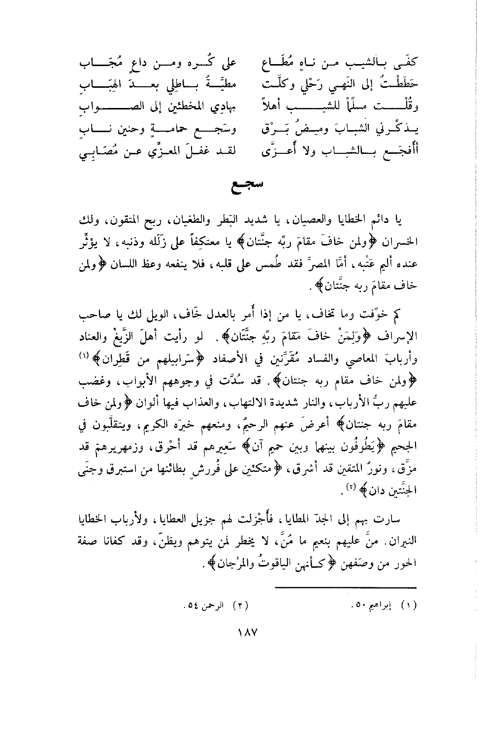 يَا دَائِمَ الْخَطَايَا وَالْعِصْيَانِ، يَا شَدِيدَ الْبَطَرِ وَالطُّغْيَانِ، رَبِحَ الْمُتَّقُونَ وَلَكَ الْخُسْرَانُ {وَلِمَنْ خَافَ مَقَامَ ربه جنتان} . يَا مُعْتَكِفًا عَلَى زَلَلِهِ وَذَنْبِهِ، لا يُؤْثَرُ عِنْدَهُ أَلِيمُ عُتْبِهِ، أَمَا الْمُصِرُّ فَقَدْ طُمِسَ عَلَى قَلْبِهِ فَلا يَنْفَعُهُ وَعْظُ اللِّسَانِ {وَلِمَنْ خاف مقام ربه جنتان} .