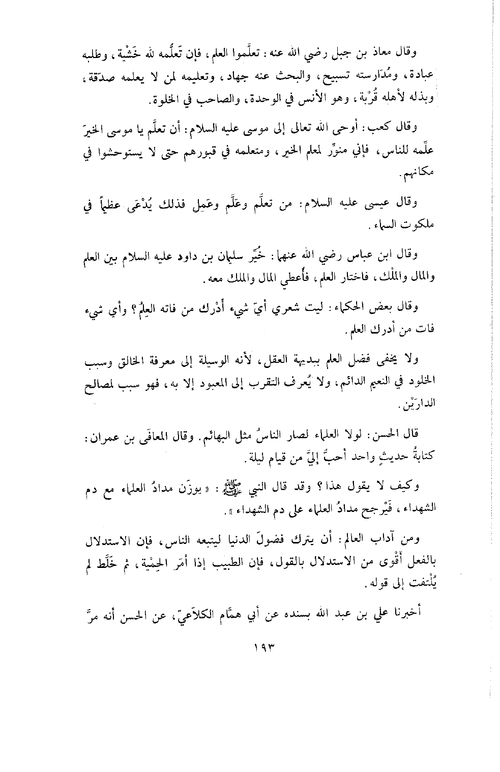 قَالَ الْحَسَنُ: لَوْلا الْعُلَمَاءُ لَصَارَ النَّاسُ مِثْلَ الْبَهَائِمِ. وَقَالَ الْمُعَافَى بْنُ عِمْرَانَ: كِتَابَةُ حَدِيثٍ وَاحِدٍ أَحَبُّ إِلَيَّ مِنْ قِيَامِ لَيْلَةٍ.