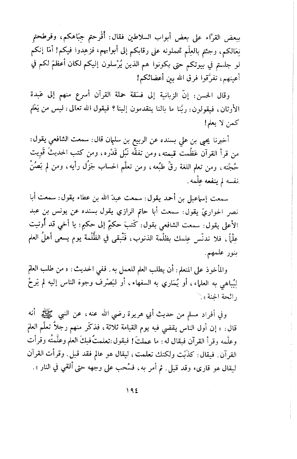 وَفِي أَفْرَادِ مُسْلِمٍ مِنْ حَدِيثِ أَبِي هُرَيْرَةَ رَضِيَ اللَّهُ عَنْهُ عَنِ النَّبِيِّ صَلَّى اللَّهُ عَلَيْهِ وَسَلَّمَ أنه أَنَّهُ قَالَ: " إِنَّ أَوَّلَ النَّاسِ يُقْضَى فِيهِ يوم القيامة ثلاثة، فذكر منهم وجلا تعلم العلم وعلمهه وَقَرَأَ الْقُرْآنَ فَيُقَالُ لَهُ: مَا عَمِلْتَ! فَيَقُولُ: تعلت فِيكَ الْعِلْمَ وَعَلَّمْتُهُ وَقَرَأْتُ الْقُرآنَ. فَيُقَالُ: كَذَبْتَ وَلَكِنَّكَ تَعَلَّمْتَ لِيُقَالَ هُوَ عَالِمٌ فَقَدْ قِيلَ. وَقَرَأْتَ الْقُرْآنَ لِيُقَالَ هُوَ قَارِئٌ وَقَدْ قِيلَ. ثُمَّ أَمَرَ بِهِ فَسُحِبَ عَلَى وَجْهِهِ حَتَّى أُلْقِيَ فِي النَّارِ ".