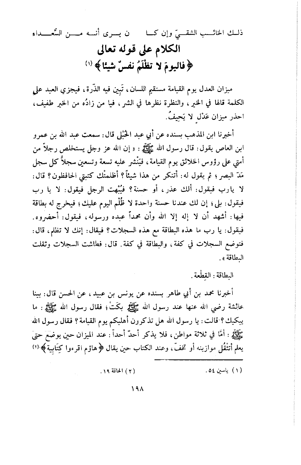 أَخْبَرَنَا ابْنُ الْمُذْهِبِ بِسَنَدِهِ عَنْ أَبِي عَبْدِ الرَّحْمَنِ الْحُبلِيِّ قَالَ: سَمِعْتُ عبد الله بن عمرو ابن الْعَاصِ يَقُولُ: قَالَ رَسُولُ اللَّهِ صَلَّى اللَّهُ عَلَيْهِ وَسَلَّمَ " إِنَّ اللَّهَ عَزَّ وَجَلَّ يَسْتَخْلِصُ رجلا من أمتي على رؤوس الْخَلائِقِ يَوْمَ الْقِيَامَةِ فَيَنْشُرُ عَلَيْهِ تِسْعَةً وَتِسْعِينَ سِجِلا كُلُّ سِجِلٍّ مَدُّ الْبَصَرِ؛ ثُمَّ يَقُولُ لَهُ: أَتُنْكِرُ مِنْ هَذَا شَيْئًا؟ أَظَلَمَتْكَ كَتَبَتِي الْحَافِظُونَ؟ قَالَ: لا يَا رَبِّ فَيَقُولُ: أَلَكَ عُذْرٌ أَوْ حَسَنَةٌ؟ فَيُبْهَتُ الرَّجُلُ فَيَقُولُ: لا يَا رَبِّ فَيَقُولُ: بَلَى؛ إِنَّ لَكَ عِنْدَنَا حَسَنَةً وَاحِدَةً لا ظُلْمَ الْيَوْمَ عَلَيْكَ؛ فَيُخْرِجُ لَهَا بِطَاقَةً فِيهَا: أَشْهَدُ أَنْ لا إِلَهَ إِلا اللَّهُ وَأَنَّ مُحَمَّدًا عَبْدُهُ وَرَسُولُهُ، فَيَقُولُ: أَحْضِرُوهُ. فَيَقُولُ: يَا رَبِّ مَا هَذِهِ الْبِطَاقَةُ مَعَ هَذِهِ السِّجِلاتِ؟ فَيُقَالُ: إِنَّكَ لا تُظْلَمُ، قَالَ: فَتُوضَعُ السِّجِلاتُ فِي كِفَّةٍ، وَالْبِطَاقَةُ فِي كِفَّةٍ. قَالَ: فَطَاشَتِ السِّجِلاتُ وَثَقُلَتِ الْبِطَاقَةُ ".