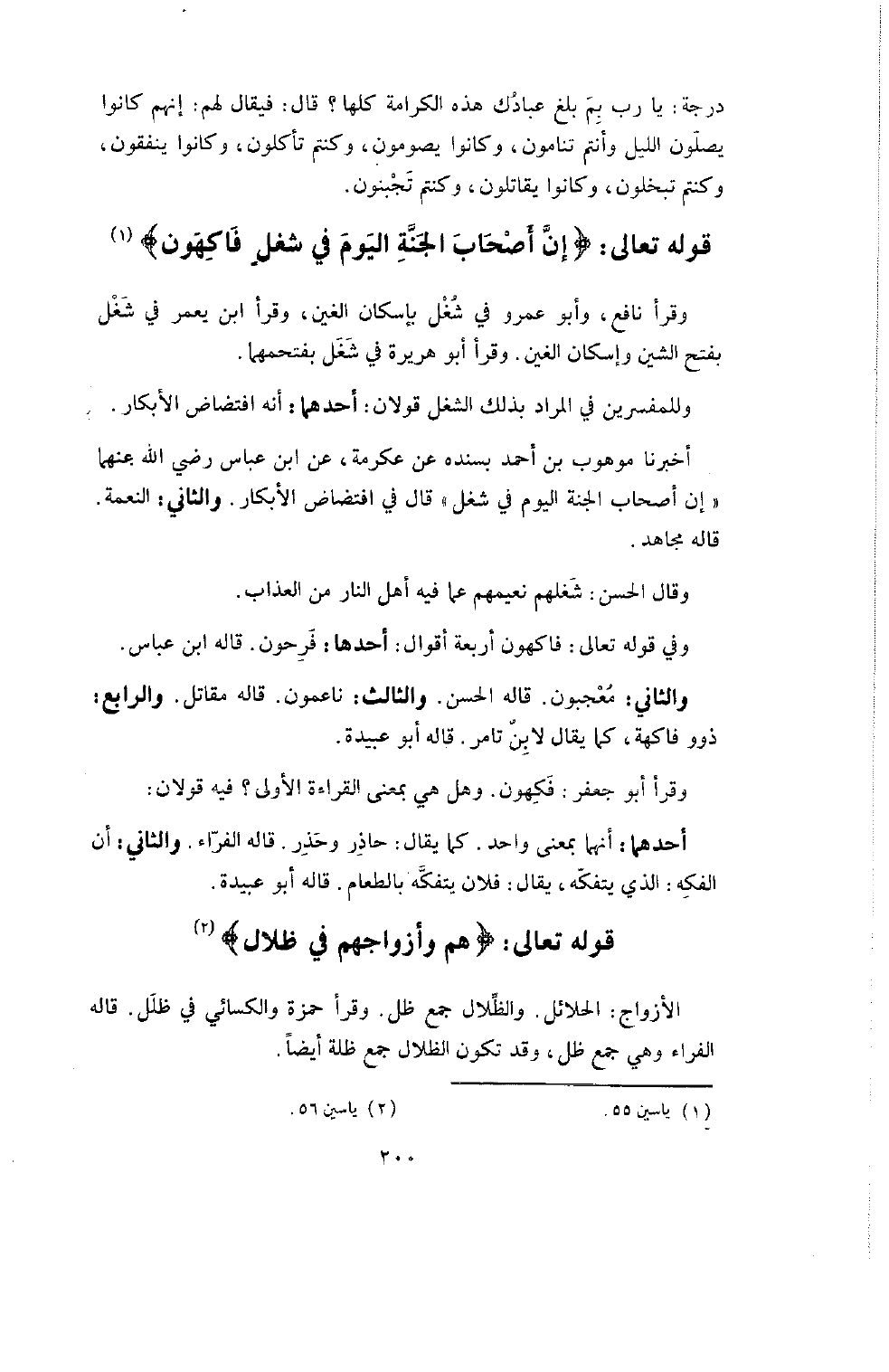أَحَدُهُمَا: أَنَّهُمَا بِمَعْنًى وَاحِدٍ. كَمَا يُقَالُ حَاذِرٌ وَحَذِرٌ. قَالَهُ الْفُرَّاءُ. وَالثَّانِي: أَنَّ الْفَكِهَ: الَّذِي يَتَفَكَّهُ، يُقَالُ فُلانٌ يَتَفَكَّهُ بِالطَّعَامِ. قَالَهُ أَبُو عُبَيْدَةَ. قَوْلُهُ تَعَالَى: {هُمْ وَأَزْوَاجُهُمْ فِي ظلال} الأَزْوَاجُ: الْحَلائِلُ. وَالظِّلالُ جَمْعُ ظِلٍّ. وَقَرَأَ حَمْزَةُ وَالْكِسَائِيُّ فِي ظُلَلٍ. قَالَهُ الْفَرَّاءُ وَهِيَ جَمْعُ ظِلٍّ، وَقَدْ تَكُونُ الظِّلالُ جَمْعُ ظُلَّةٍ أَيْضًا.