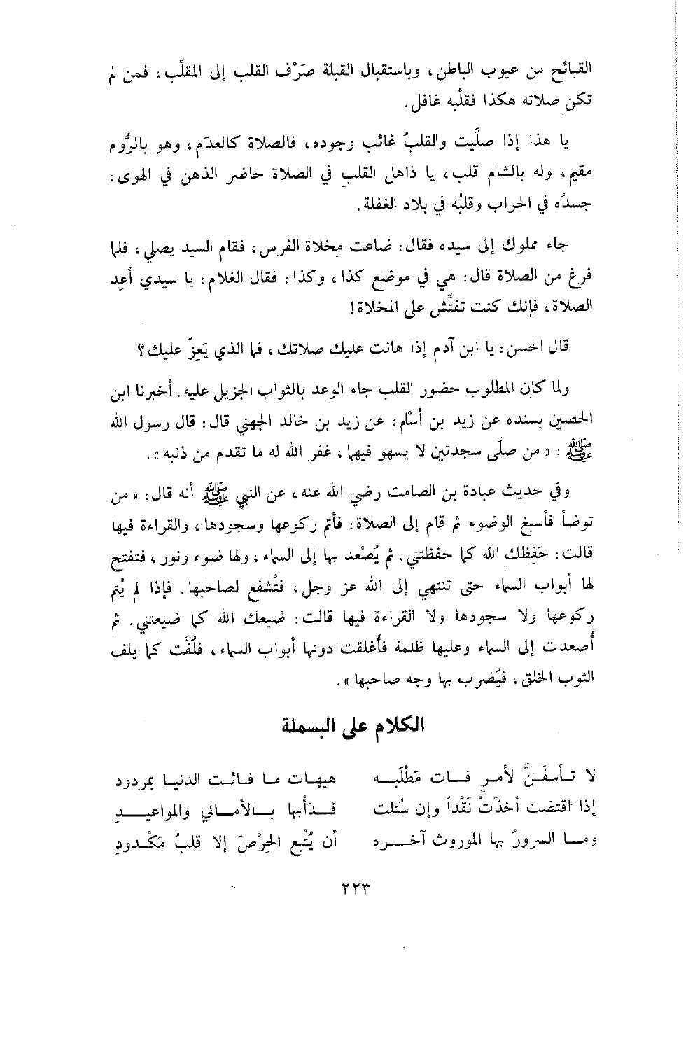 يَا هَذَا إِذَا صَلَّيْتَ وَالْقَلْبُ غَائِبٌ وُجُودُهُ فَالصَّلاةُ كَالْعَدَمِ، وَهُوَ بِالرُّومِ مُقيِمٌ وَلَهُ بِالشَّامِ قَلْبٌ، يَا ذَاهِلَ الْقَلْبِ فِي الصَّلاةِ حَاضِرَ الذِّهْنِ فِي الْهَوَى، جَسَدُهُ فِي الْمِحْرَابِ وَقَلْبُهُ فِي بِلادِ الْغَفْلَةِ.