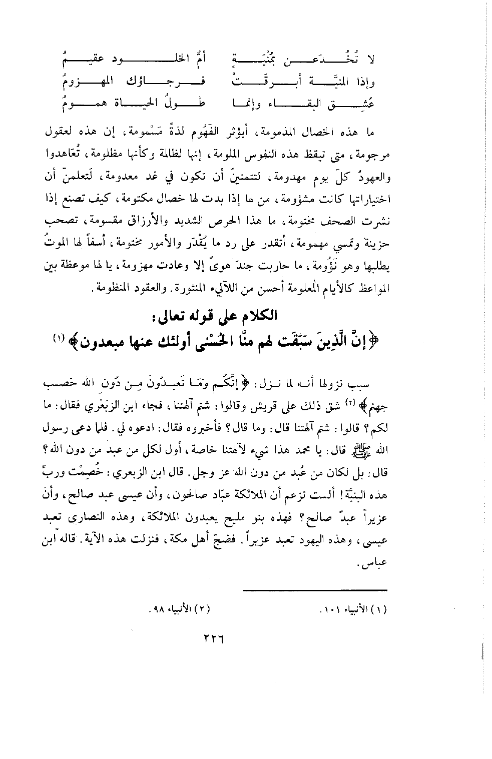 الْكَلامُ عَلَى قَوْلِهِ تَعَالَى: {إِنَّ الَّذِينَ سَبَقَتْ لَهُمْ مِنَّا الْحُسْنَى أُولَئِكَ عنها مبعدون} سَبَبُ نُزُولِهَا أَنَّهُ لَمَّا نَزَلَ: {إِنَّكُمْ وَمَا تعبدون من دون الله حصب جهنم} شَقَّ ذَلِكَ عَلَى قُرَيْشٍ وَقَالُوا: شَتَمَ آلِهَتَنَا فجاء ابن الزبعرى فقال: مالكم؟ قَالُوا: شَتَمَ آلِهَتَنَا قَالَ: وَمَا قَالَ؟ فَأَخْبَرُوهُ فَقَالَ: ادْعُوهُ لِي. فَلَمَّا دُعِيَ رَسُولُ اللَّهِ صَلَّى اللَّهُ عَلَيْهِ وَسَلَّمَ قَالَ: يَا مُحَمَّدُ هَذَا شَيْءٌ لآلِهَتِنَا خَاصَّةً أَوْ لِكُلِّ مَنْ عُبِدَ مِنْ دُونِ اللَّهِ؟ قَالَ: بَلْ لِكُلِّ مَنْ عُبِدَ مِنْ دُونِ اللَّهِ عَزَّ وَجَلَّ. قَالَ ابْنُ الزَّبْعَرَى: خُصِمْتَ وَرَبِّ هَذِهِ الْبِنْيَةِ! أَلَسْتَ تَزْعُمُ أَنَّ الْمَلائِكَةَ عِبَادٌ صَالِحُونَ وَأَنَّ عِيسَى عَبْدٌ صَالِحٌ، وَأَنَّ عُزَيْرًا عَبْدٌ صَالِحٌ؟ فَهَذِهِ بَنُو مُلَيْحٍ يَعْبُدُونَ الْمَلائِكَةَ، وَهَذِهِ النَّصَارَى تَعْبُدُ عِيسَى، وَهَذِهِ الْيَهُودُ تَعْبُدُ عُزَيْرًا، فَضَجَّ أَهْلُ مَكَّةَ فَنَزَلَتْ هَذِهِ الآيَةُ. قَالَهُ ابْنُ عباس.