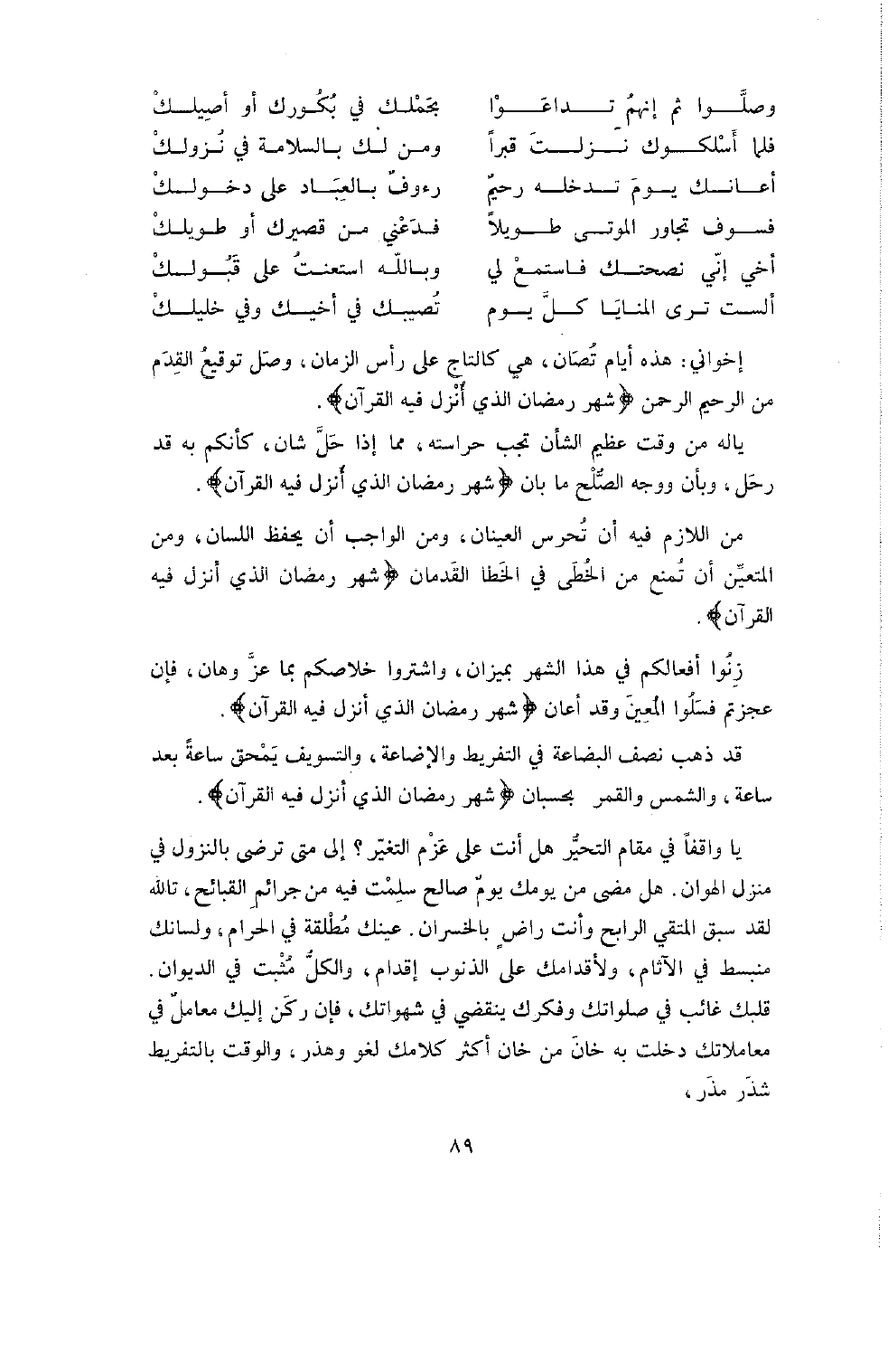 يَا لَهُ مِنْ وَقْتٍ عَظِيمِ الشَّانِ تَجِبُ حِرَاسَتُهُ مِمَّا إِذَا حَلَّ شَانَ، كَأَنَّكُمْ بِهِ قَدْ رَحَلَ وَبَانَ وَوَجْهُ الصُّلْحِ مَا بَانَ {شهر رمضان الذي أنزل فيه القرآن} .