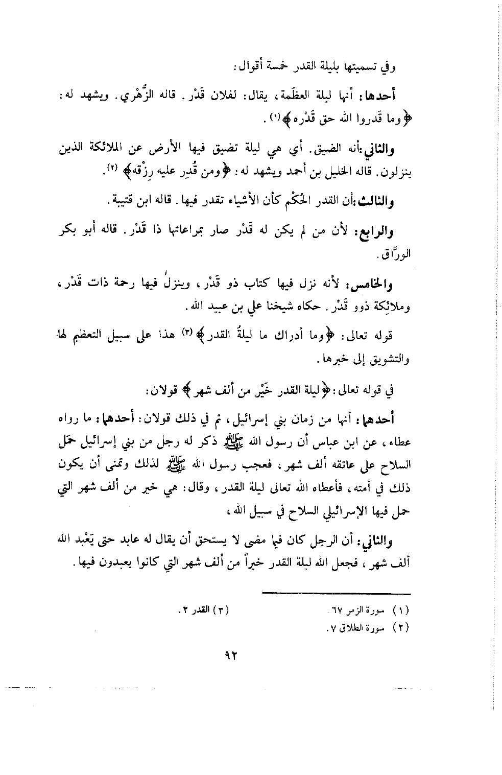 في قَوْلِهِ تَعَالَى: {لَيْلَةُ الْقَدْرِ خَيْرٌ مِنْ أَلْفِ شهر} قولان: أحدهما: أنها مِنْ زَمَانِ بَنِي إِسْرَائِيلَ ثُمَّ فِي ذَلِكَ قَوْلانِ: أَحَدُهُمَا مَا رَوَاهُ عَطَاءٌ عَنِ ابْنِ عَبَّاسٍ أَنَّ رَسُولَ اللَّهِ صَلَّى اللَّهُ عَلَيْهِ وَسَلَّمَ ذُكِرَ لَهُ رَجُلٌ مِنْ بَنِي إِسْرَائِيلَ حَمَلَ السِّلاحَ عَلَى عَاتِقِهِ أَلْفَ شَهْرٍ فَعَجِبَ رَسُولُ اللَّهِ صَلَّى اللَّهُ عَلَيْهِ وَسَلَّمَ لِذَلِكَ وَتَمَنَّى أَنْ يَكُونَ ذَلِكَ فِي أُمَّتِهِ، فَأَعْطَاهُ اللَّهُ تَعَالَى لَيْلَةَ الْقَدْرِ، وَقَالَ: هِيَ خَيْرٌ مِنْ أَلْفِ شَهْرٍ الَّتِي حَمَلَ فِيهَا الإِسْرَائِيلِيُّ السِّلاحَ فِي سَبِيلِ اللَّهِ، وَالثَّانِي: أَنَّ الرَّجُلَ كَانَ فِيمَا مَضَى لا يَسْتَحِقُّ أَنْ يُقَالَ لَهُ عَابِدٌ حَتَّى يَعْبُدَ اللَّهَ أَلْفَ شَهْرٍ، فَجَعَلَ اللَّهُ لَيْلَةَ الْقَدْرِ خَيْرًا مِنْ أَلْفِ شَهْرٍ الَّتِي كَانُوا يَعْبُدُونَ فِيهَا.