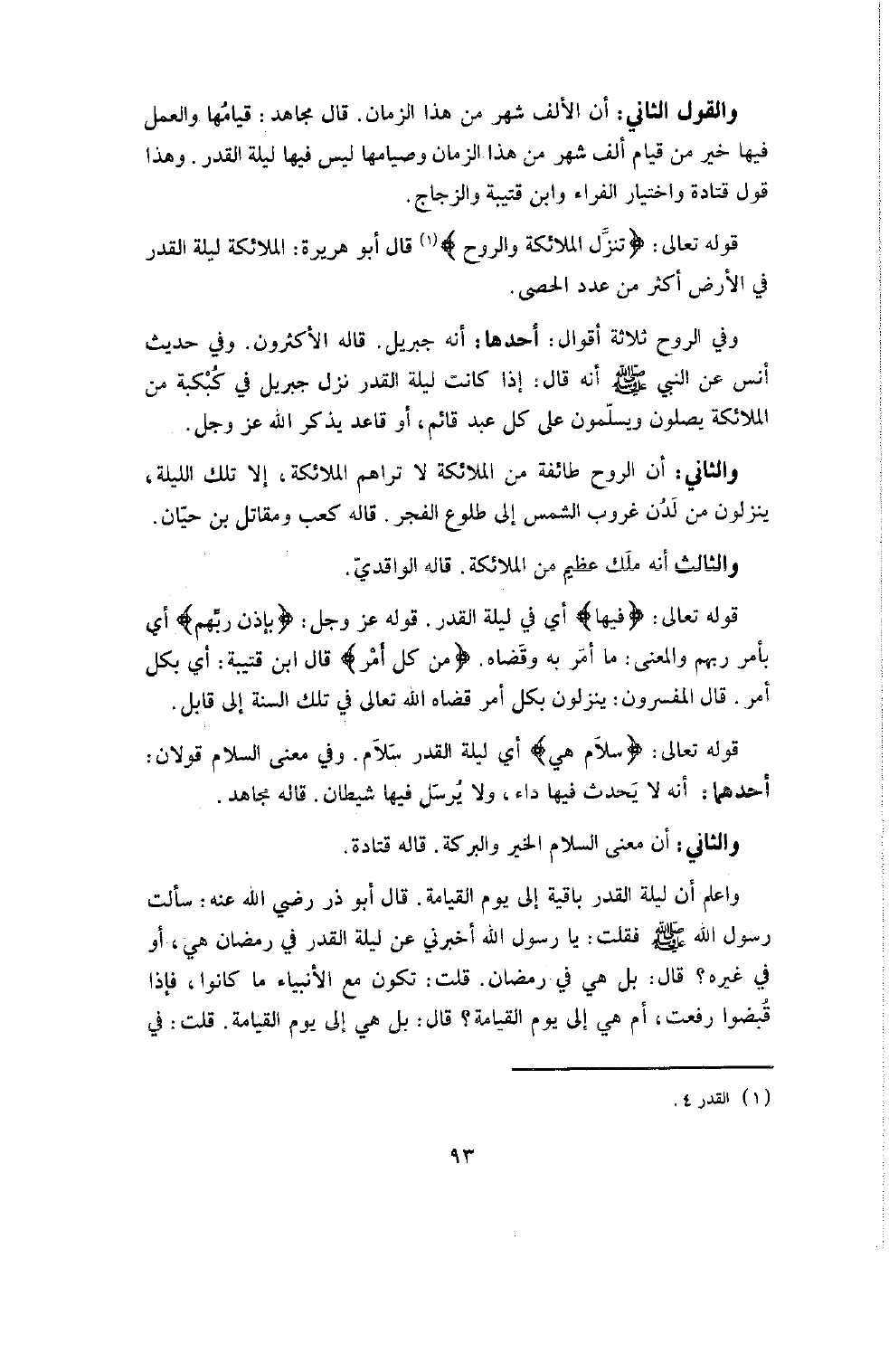 وَفِي الرُّوحِ ثَلاثَةُ أَقْوَالٍ: أَحَدُهَا: أَنَّهُ جِبْرِيلُ. قَالَهُ الأَكْثَرُونَ. وَفِي حَدِيثِ أَنَسٍ عَنِ النَّبِيِّ صَلَّى اللَّهُ عَلَيْهِ وَسَلَّمَ أَنَّهُ قَالَ: إِذَا كَانَتْ لَيْلَةُ الْقَدْرِ نَزَلَ جِبْرِيلُ فِي كَبْكَبَةٍ مِنَ الْمَلائِكَةِ يُصَلُّونَ وَيُسَلِّمُونَ عَلَى كُلِّ عَبْدٍ قَائِمٍ أَوْ قاعد يذكر اللَّهِ عَزَّ وَجَلَّ.